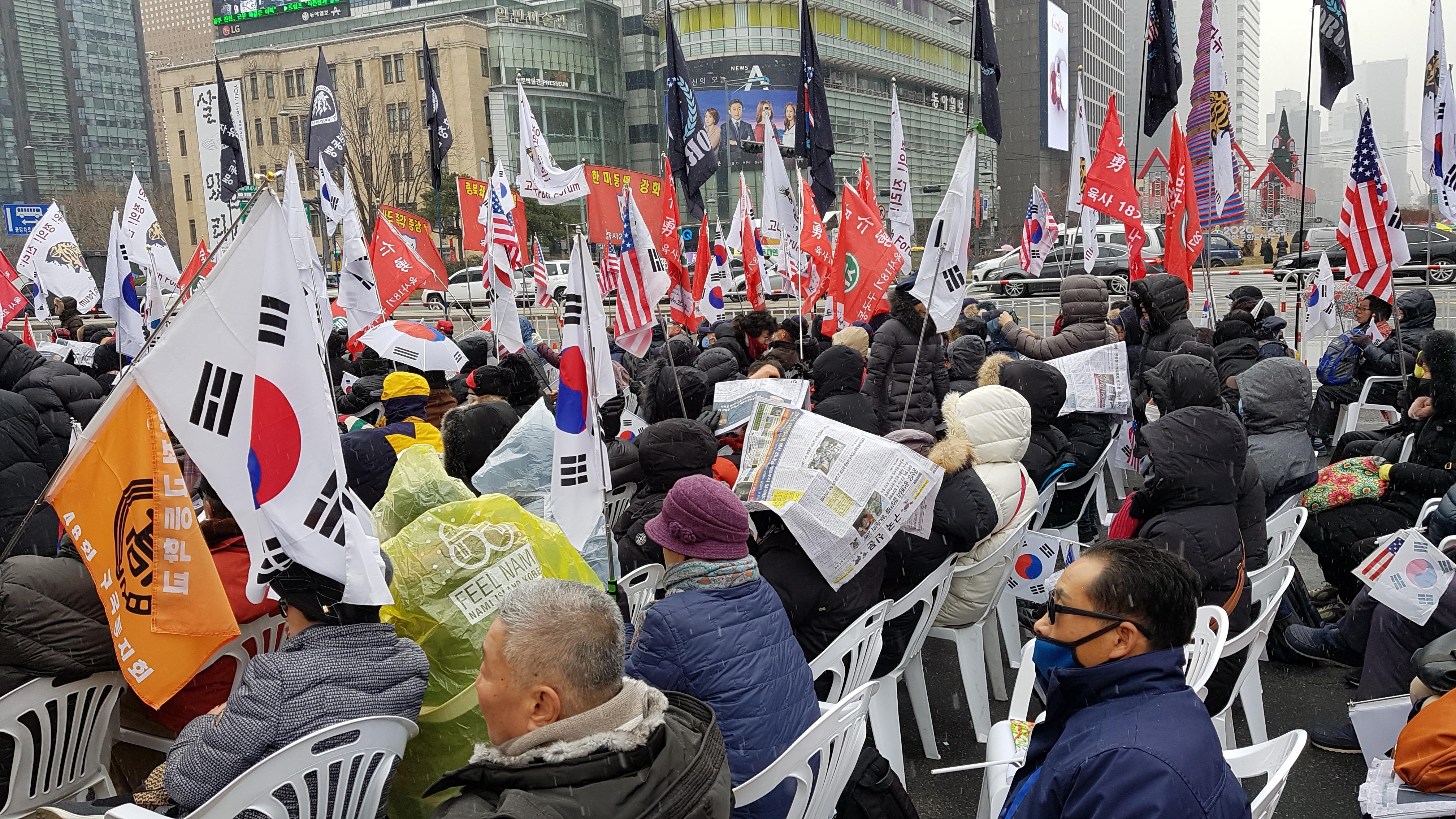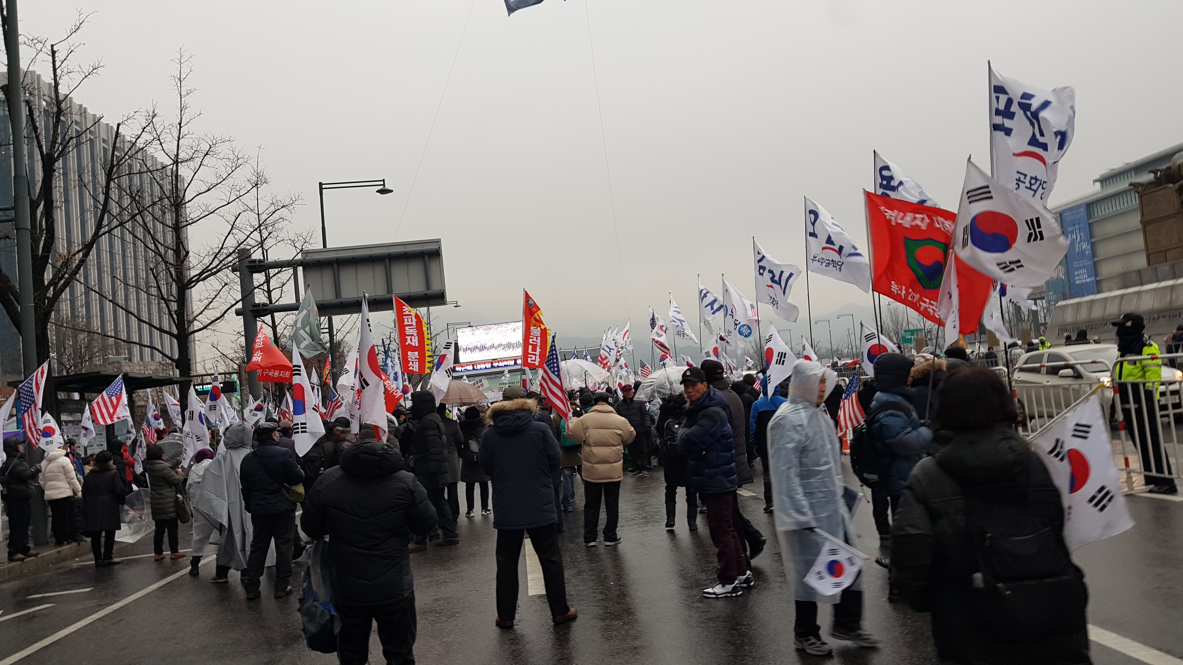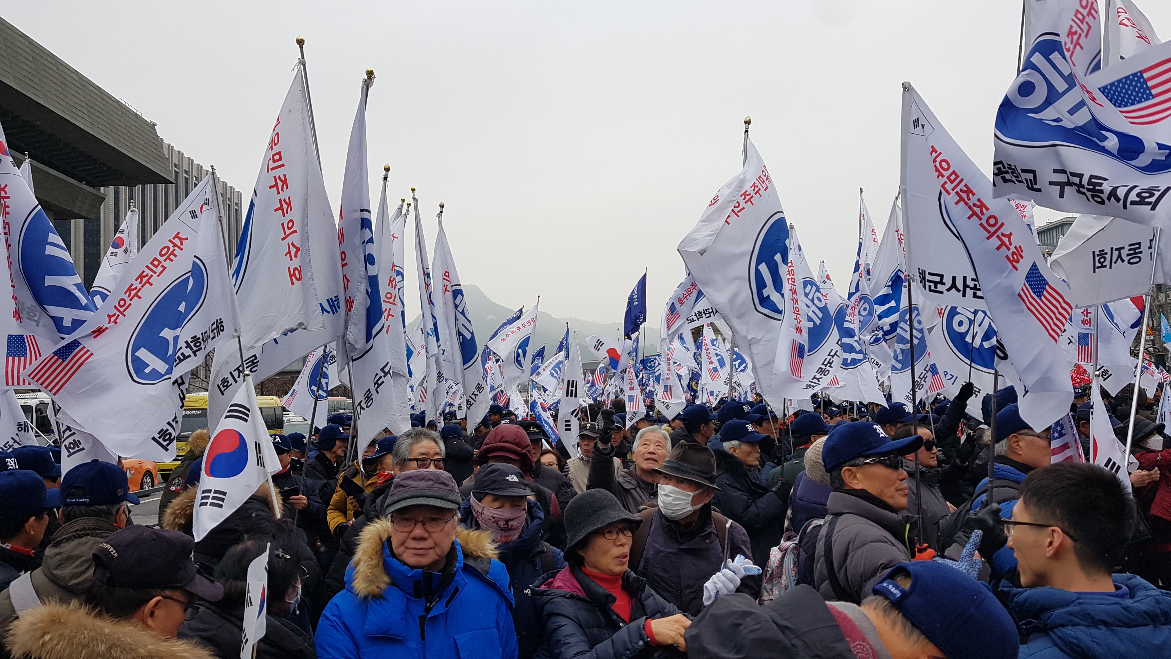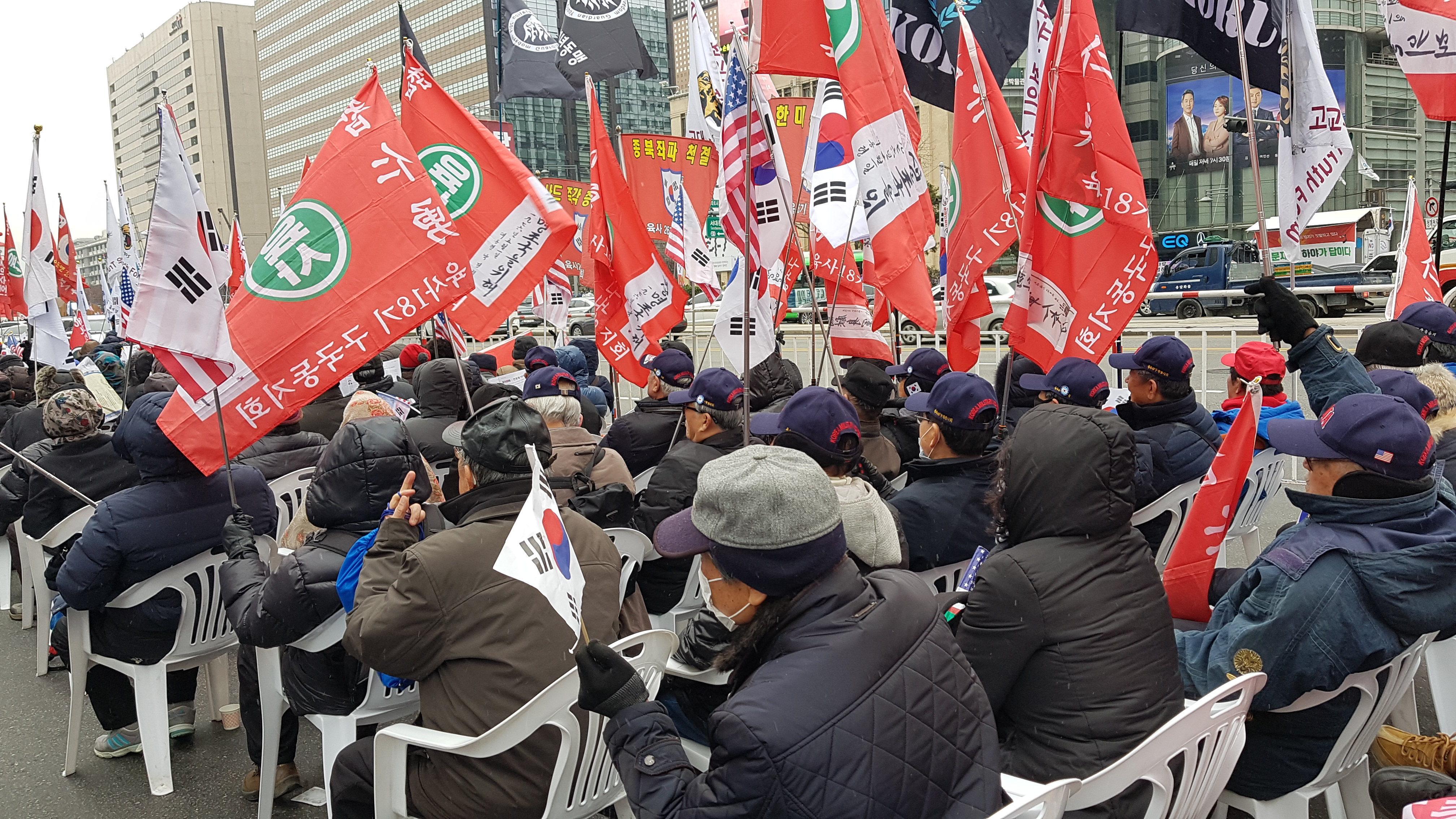 날씨는 몹시 쌀쌀하고 진눈깨비까지 내려 을씨년스런 토요일 오후이다. 그런데도 광화문지역에 모인 애국시민들은 줄어들지 않았다. 추위와 눈바람속에서도 도로위 아스팔트에서 굳건히 자리를 지키고 있다. 외치는 구호가 내리는 싸락눈따라 더 높이, 더 널리 허공으로 퍼져 나간다. 종교의식에서는 '할렐루야' 외치는 소리가 하늘까지 미치지 않겠나 싶다. 사람의 힘으로는 하지 못할 일도 '하나님의 권능'으로 능히 해낼 것으로 믿고 기도를 올린다. 불교, 천주교도 동참하여 뜻을 함께 했다.