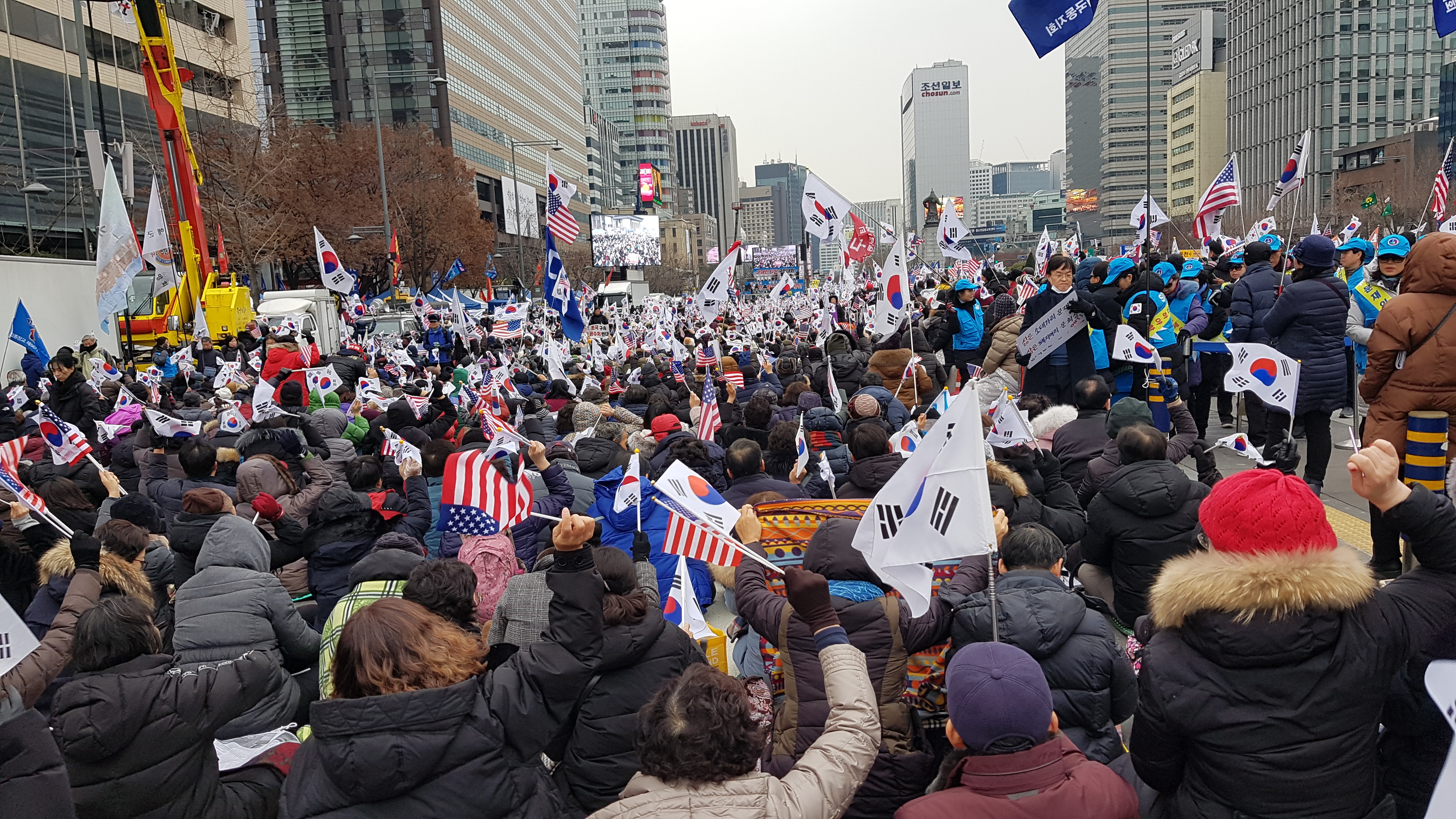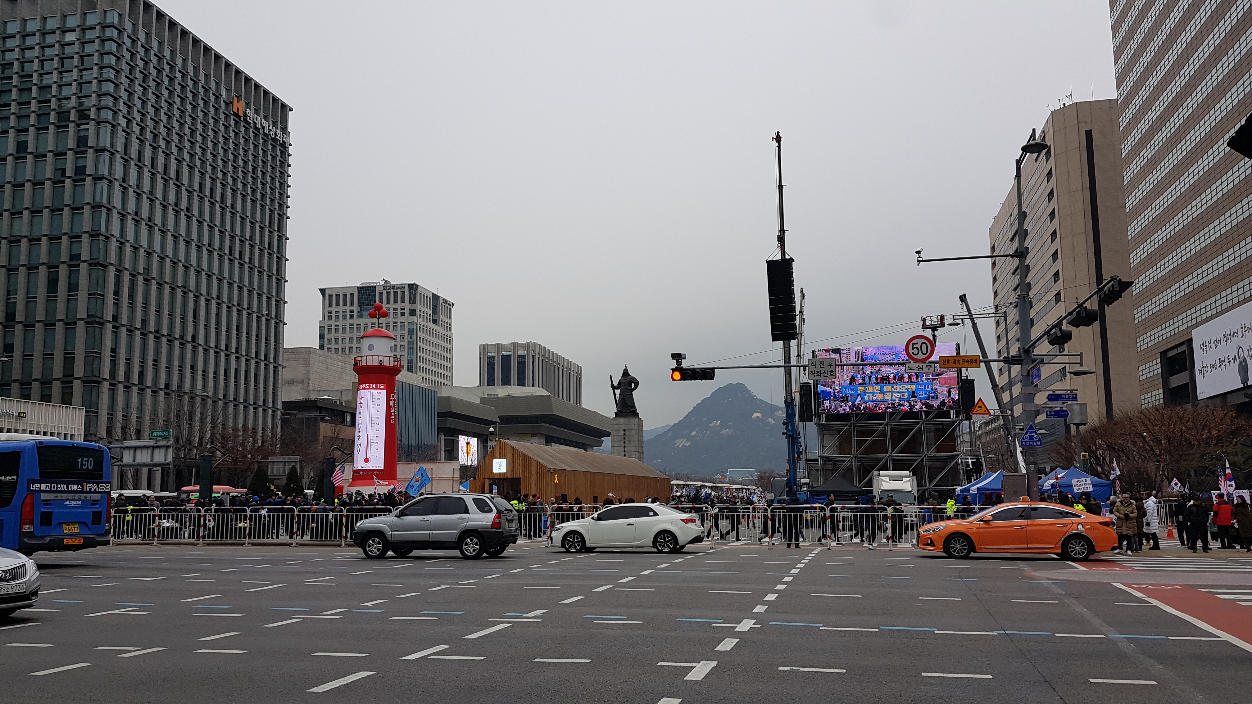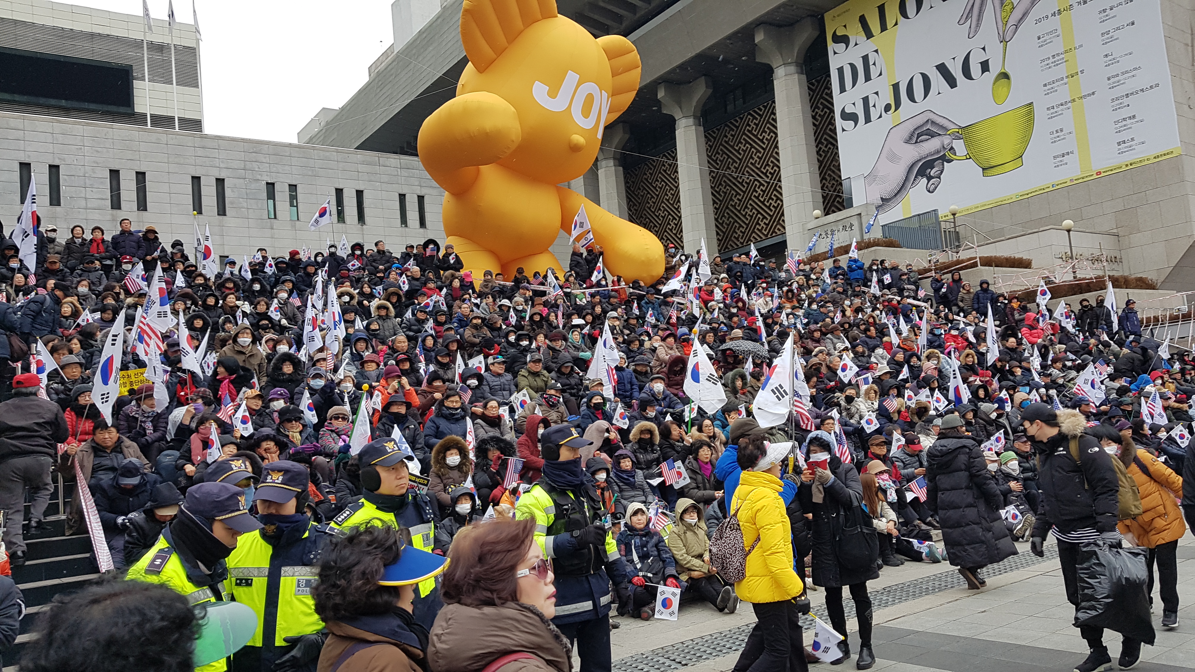 날씨는 몹시 쌀쌀하고 진눈깨비까지 내려 을씨년스런 토요일 오후이다. 그런데도 광화문지역에 모인 애국시민들은 줄어들지 않았다. 추위와 눈바람속에서도 도로위 아스팔트에서 굳건히 자리를 지키고 있다. 외치는 구호가 내리는 싸락눈따라 더 높이, 더 널리 허공으로 퍼져 나간다. 종교의식에서는 '할렐루야' 외치는 소리가 하늘까지 미치지 않겠나 싶다. 사람의 힘으로는 하지 못할 일도 '하나님의 권능'으로 능히 해낼 것으로 믿고 기도를 올린다. 불교, 천주교도 동참하여 뜻을 함께 했다.