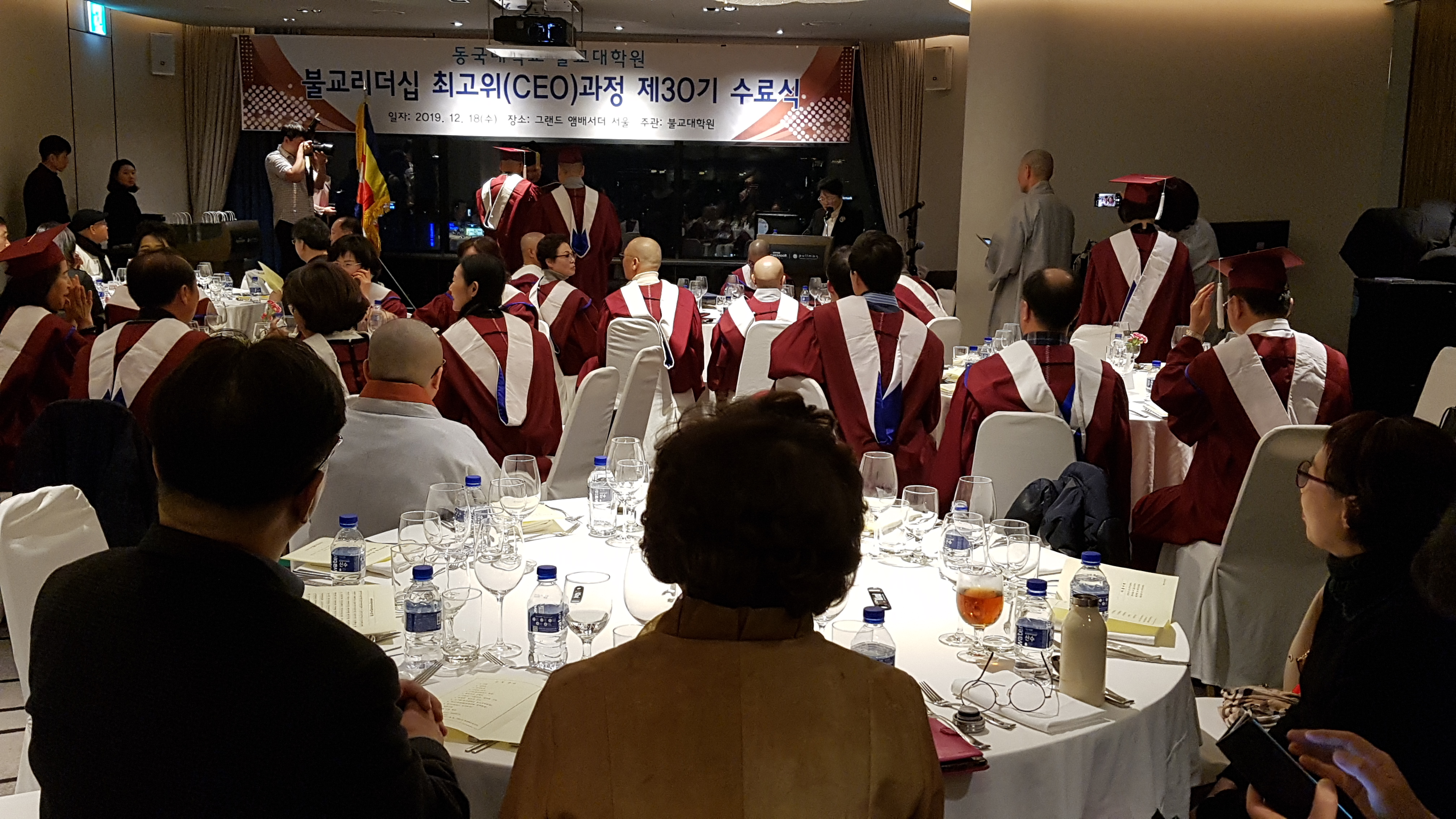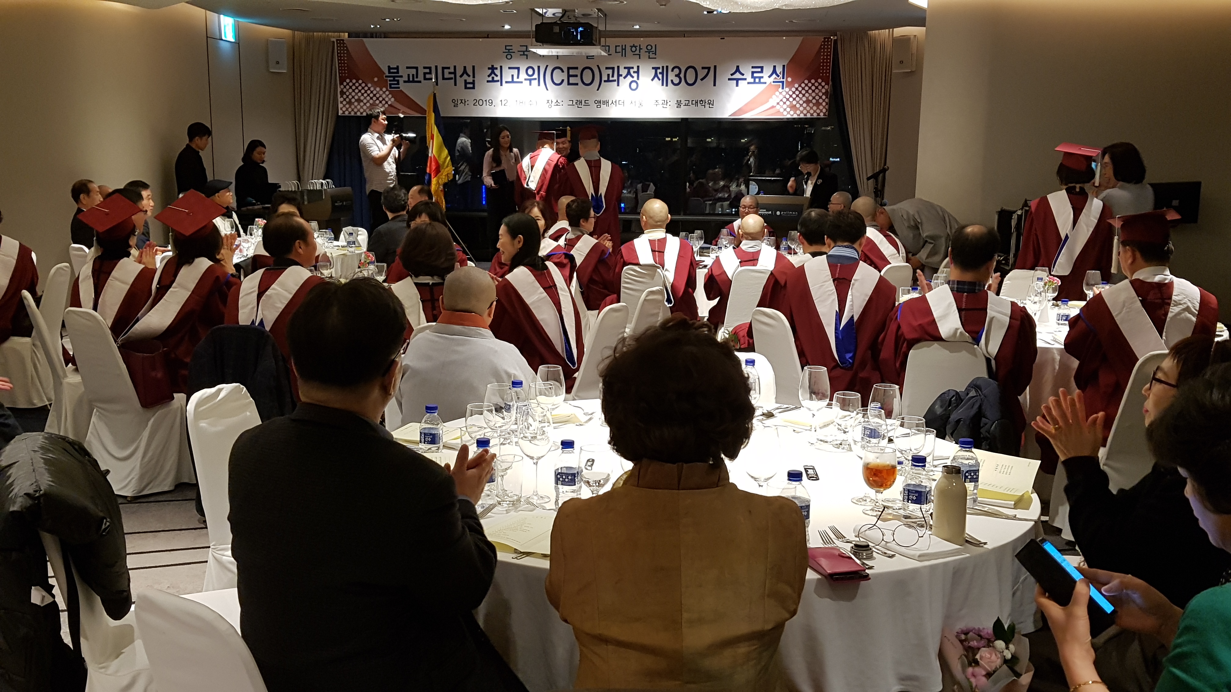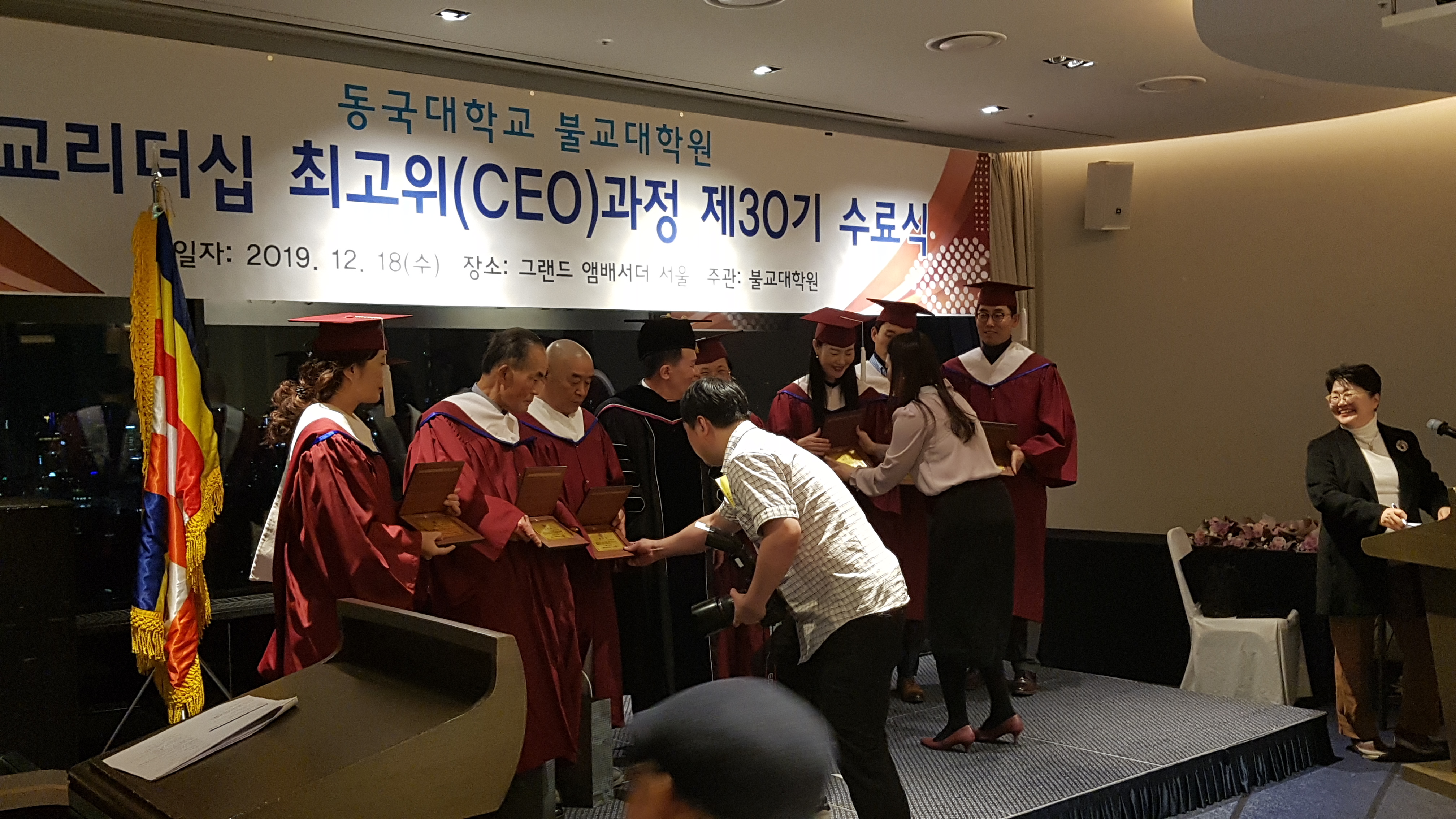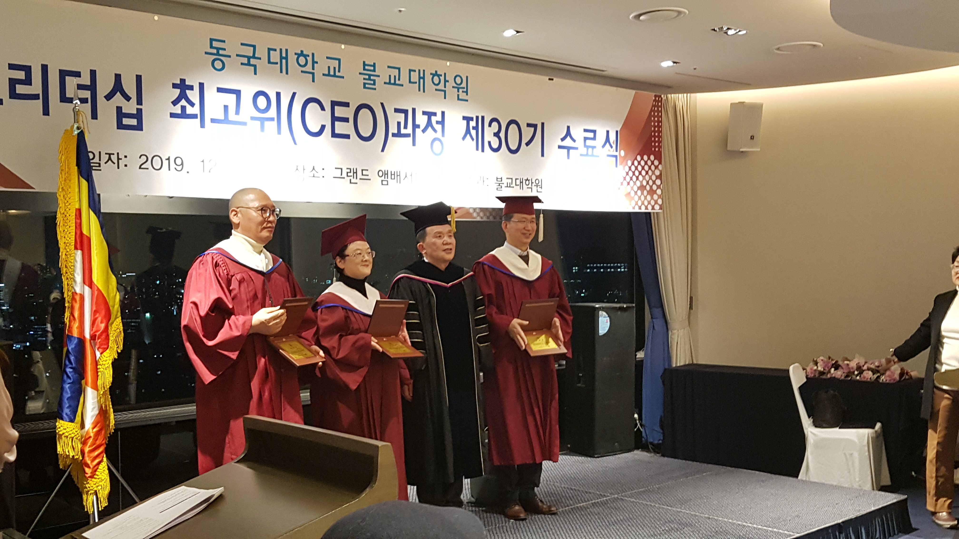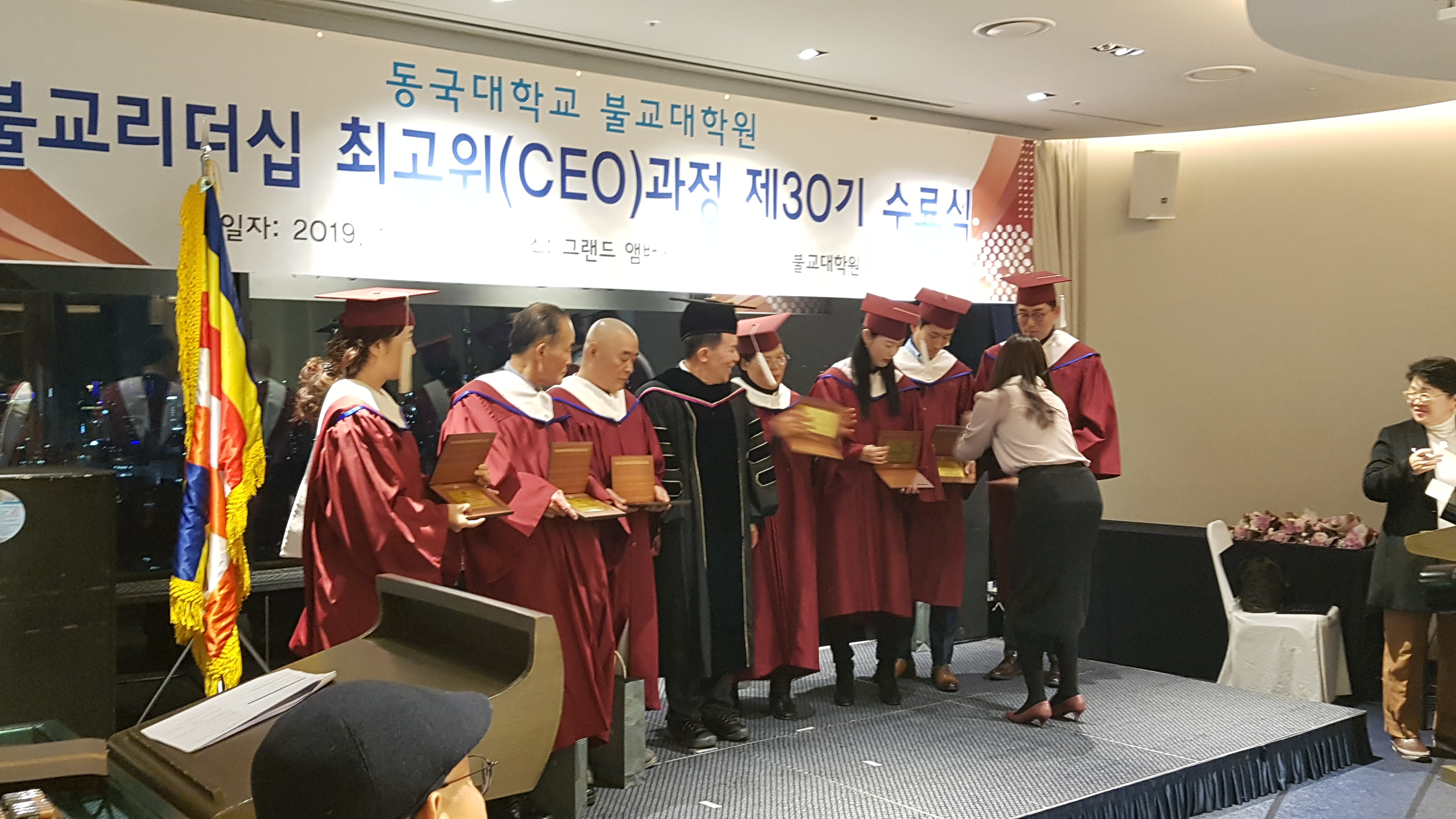 동국대 윤성이총장 참석하에 불교대학원 신성현원장 주관으로 동불최고위 30기 45명에 대한 수료식이 12.18 저녁 앰버서더호텔에서 여러 선배기수 회장과 축하객들이 참석한 가운데 개최되었다.