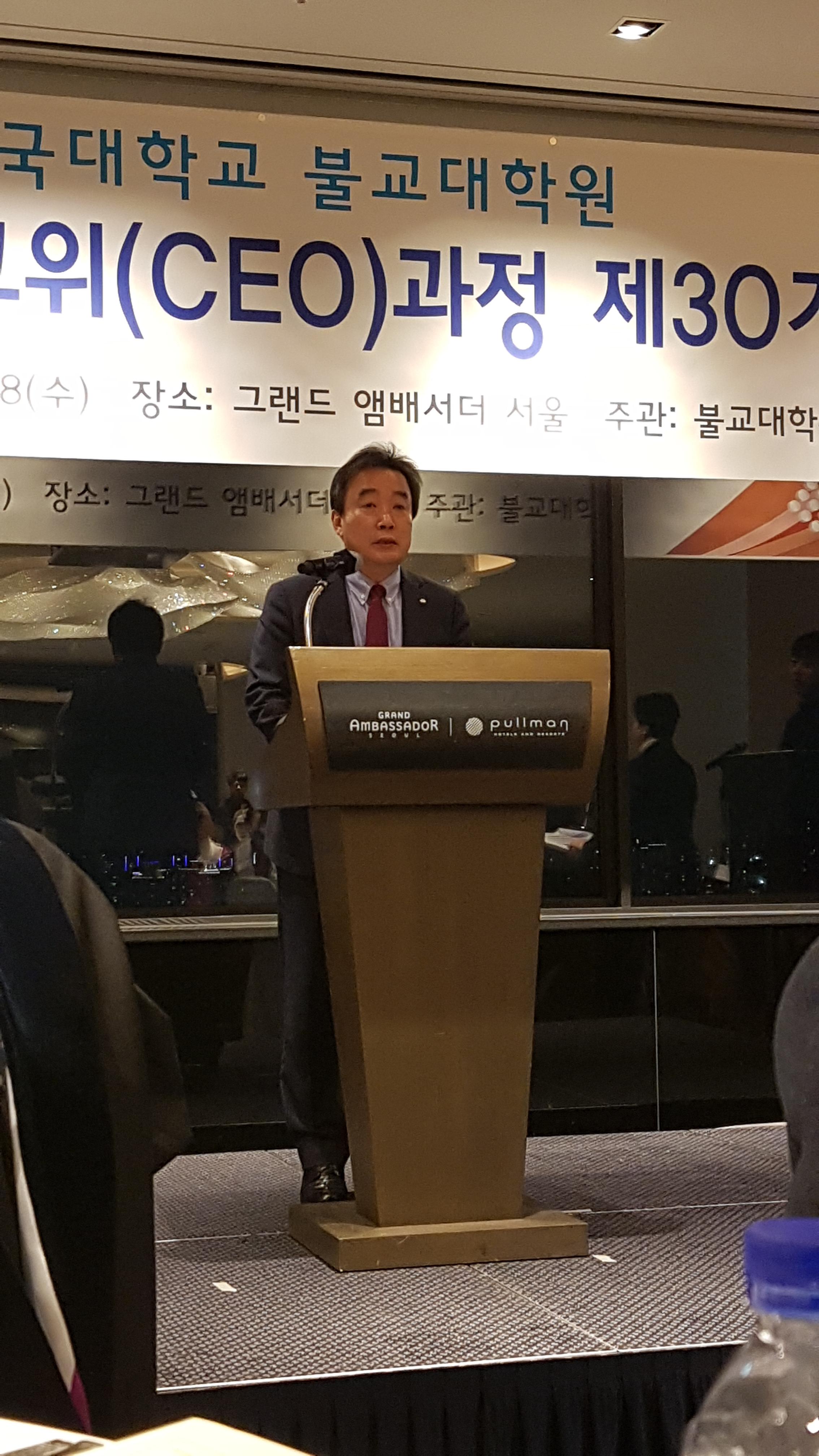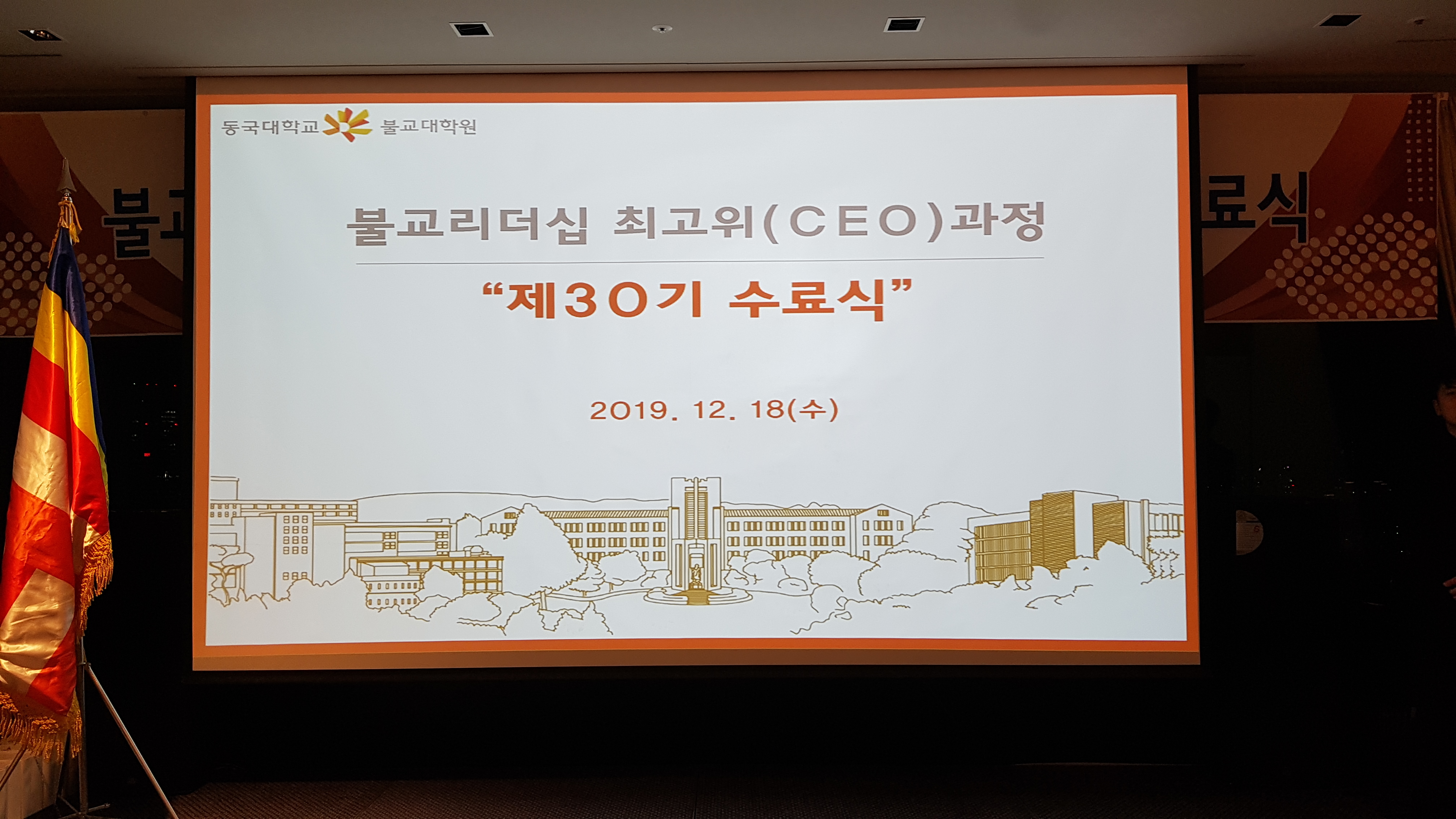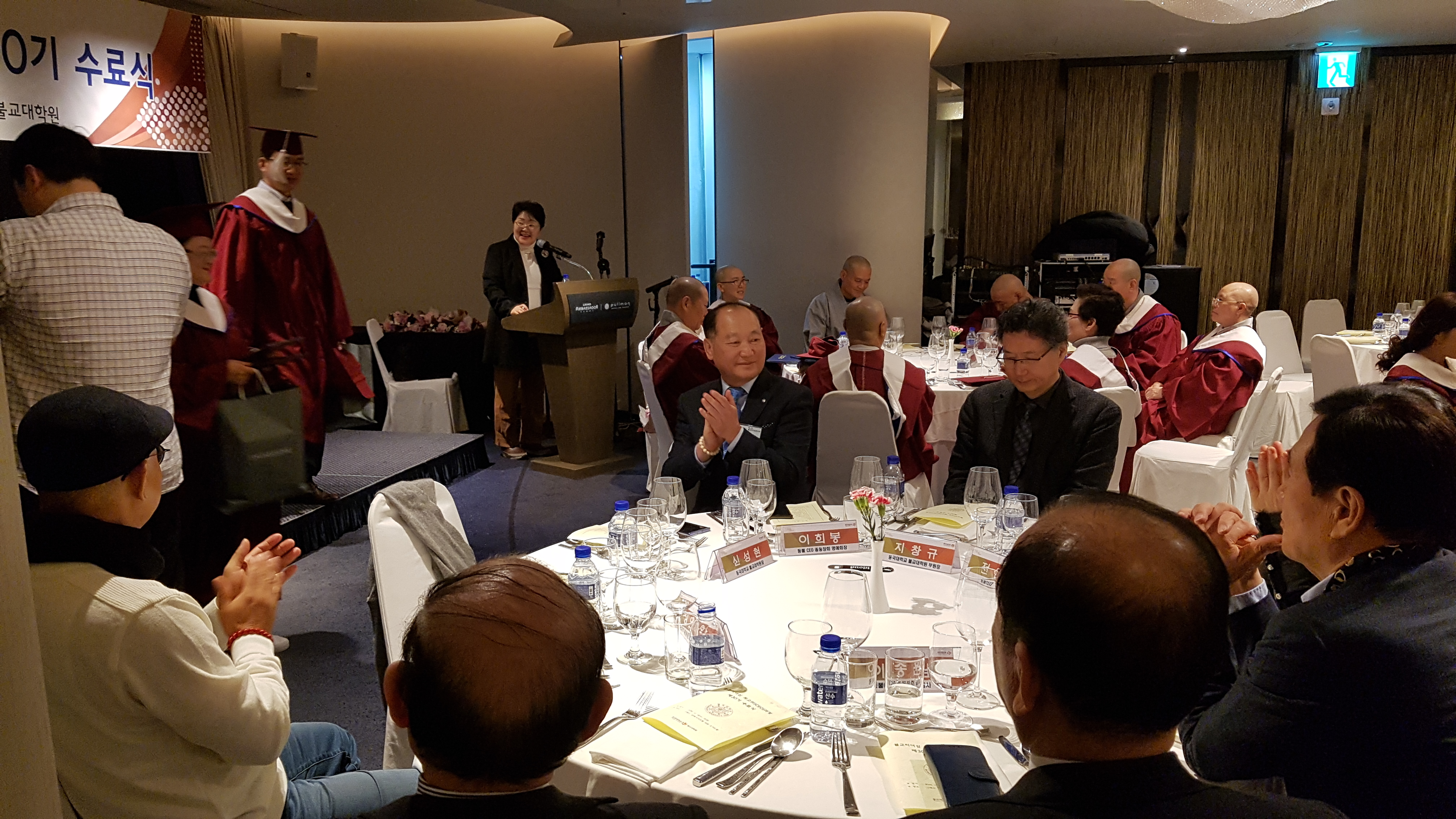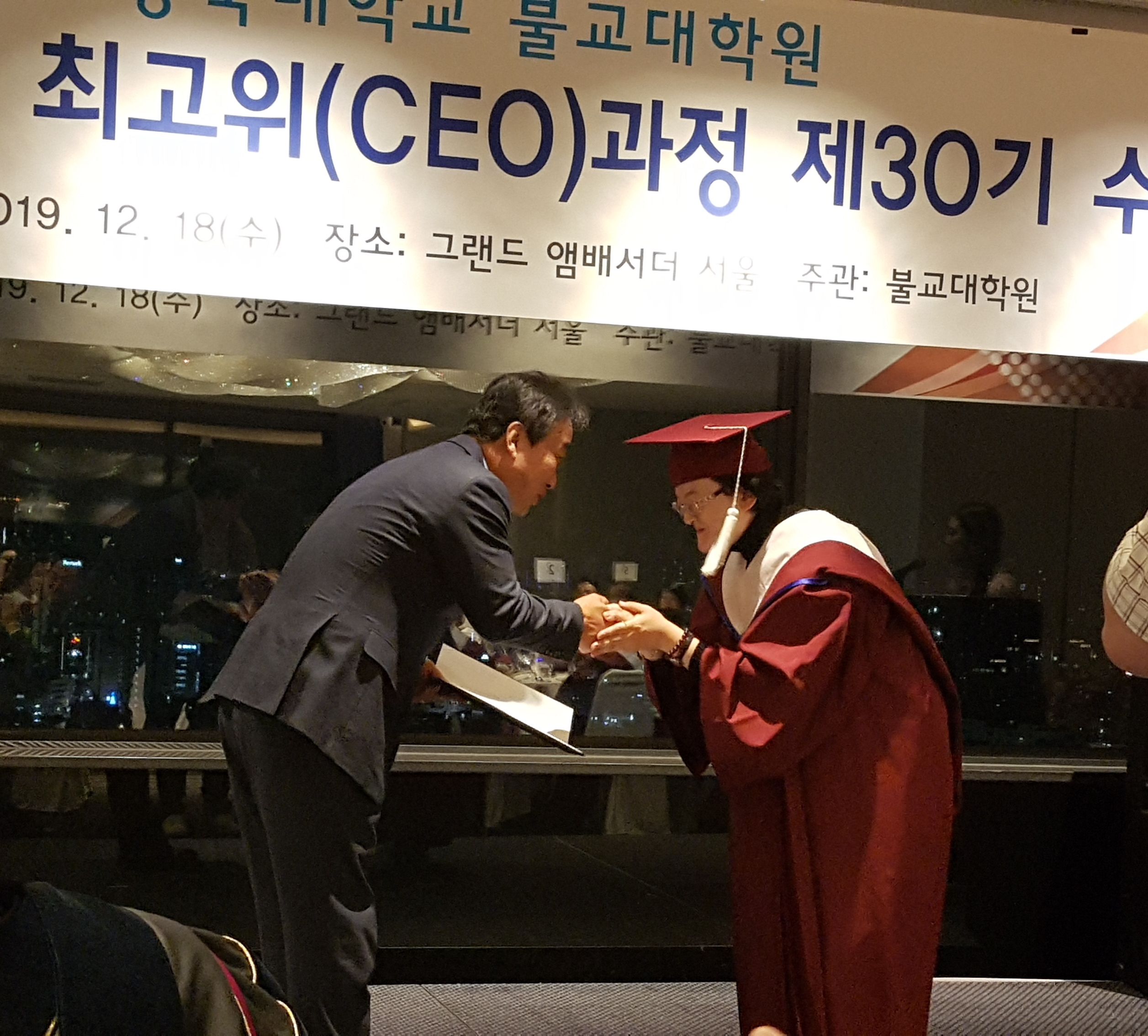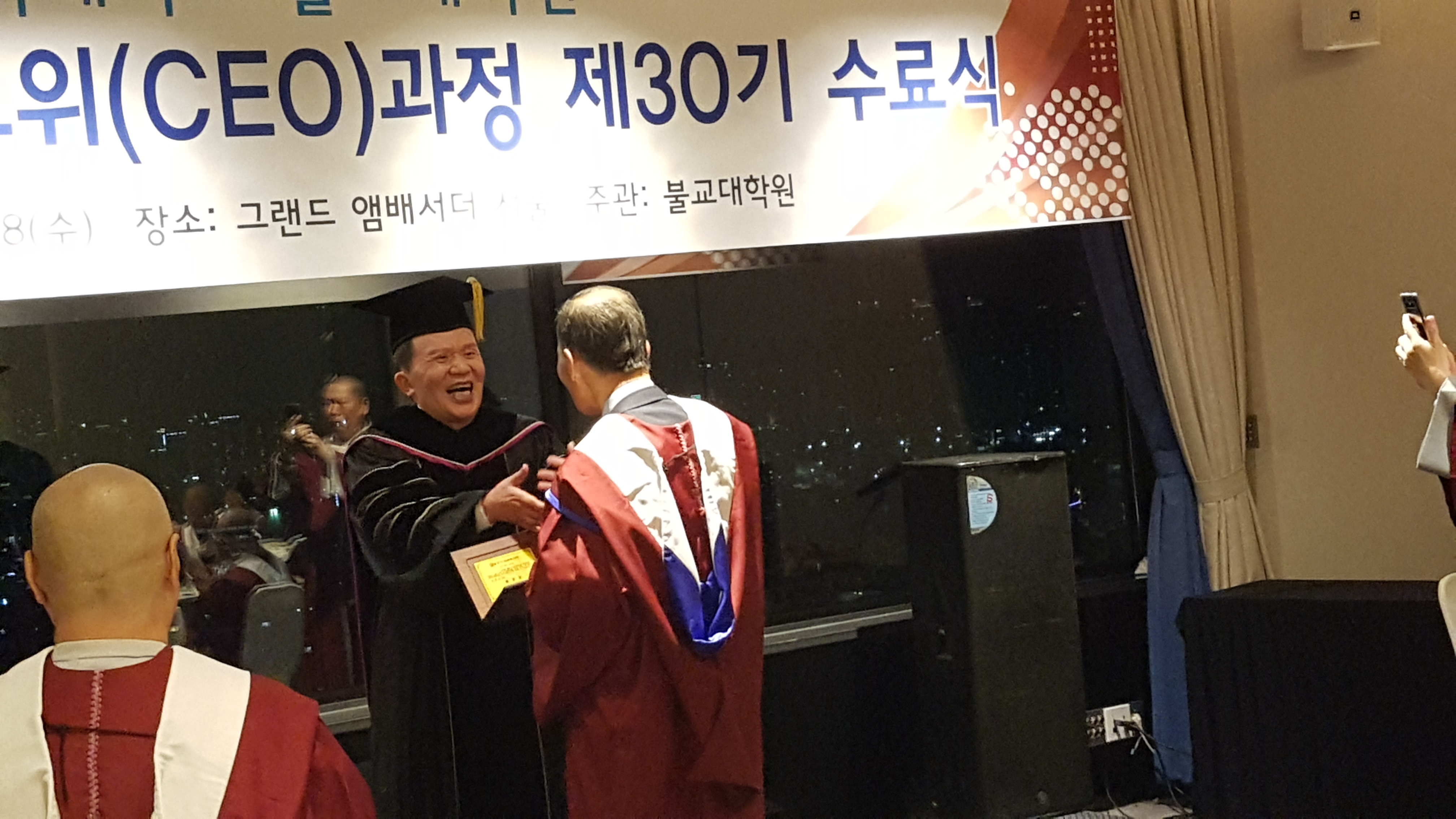 동국대 윤성이총장 참석하에 불교대학원 신성현원장 주관으로 동불최고위 30기 45명에 대한 수료식이 12.18 저녁 앰버서더호텔에서 여러 선배기수 회장과 축하객들이 참석한 가운데 개최되었다.