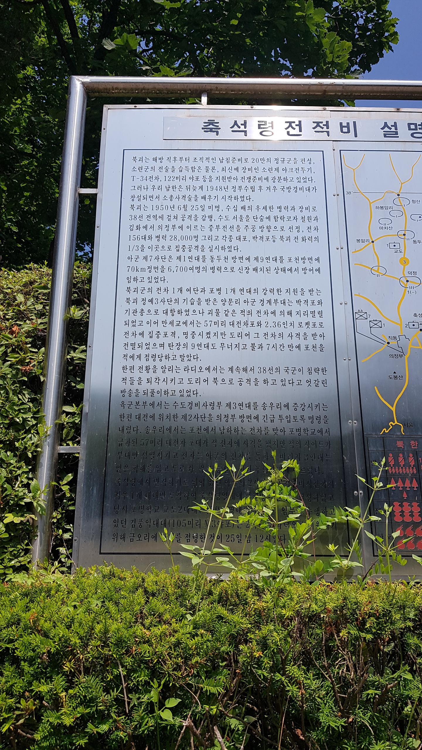 탱크가 한대도 없었고 대전차무기도 없었던 한국군은 소련제 T-34탱크를 앞세우고 공격해오는 적을 멈추게 할 어떠한 수단도 없었다. 그러던 차에 여기 축석령에서 그 첫벗째 성과를 이루었다. 당시 포병대대장 김풍익소령은 대포를 적전차 접근로 전방으로 이동시켜 적전차가 100m까지 다가오기를 기다렸다가 직접조준하여 발사했다. 전차 궤도가 끊어지고 멈춰서게 한 전과를 올린 것이다. 그러나 다음번 포탄을 장전하는 사이에 바로 뒤의 전차에 의한 사격으로 전원이 현장에서 사망하고 말았다.