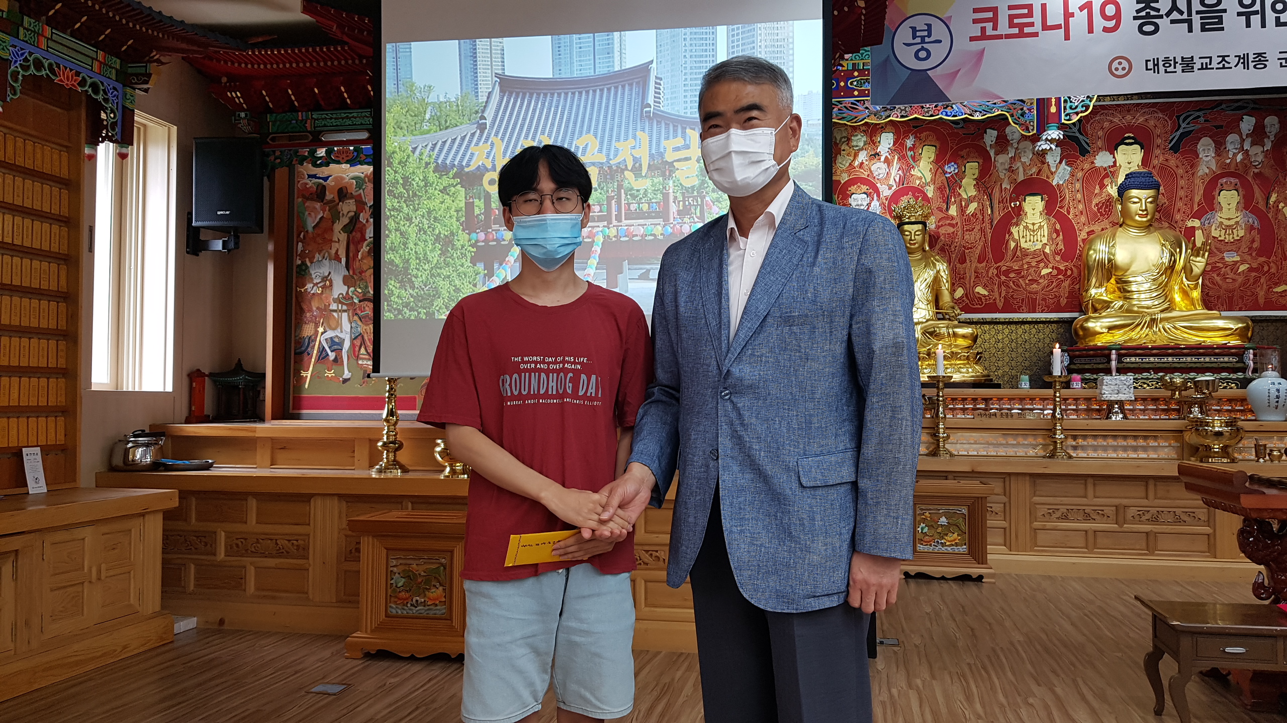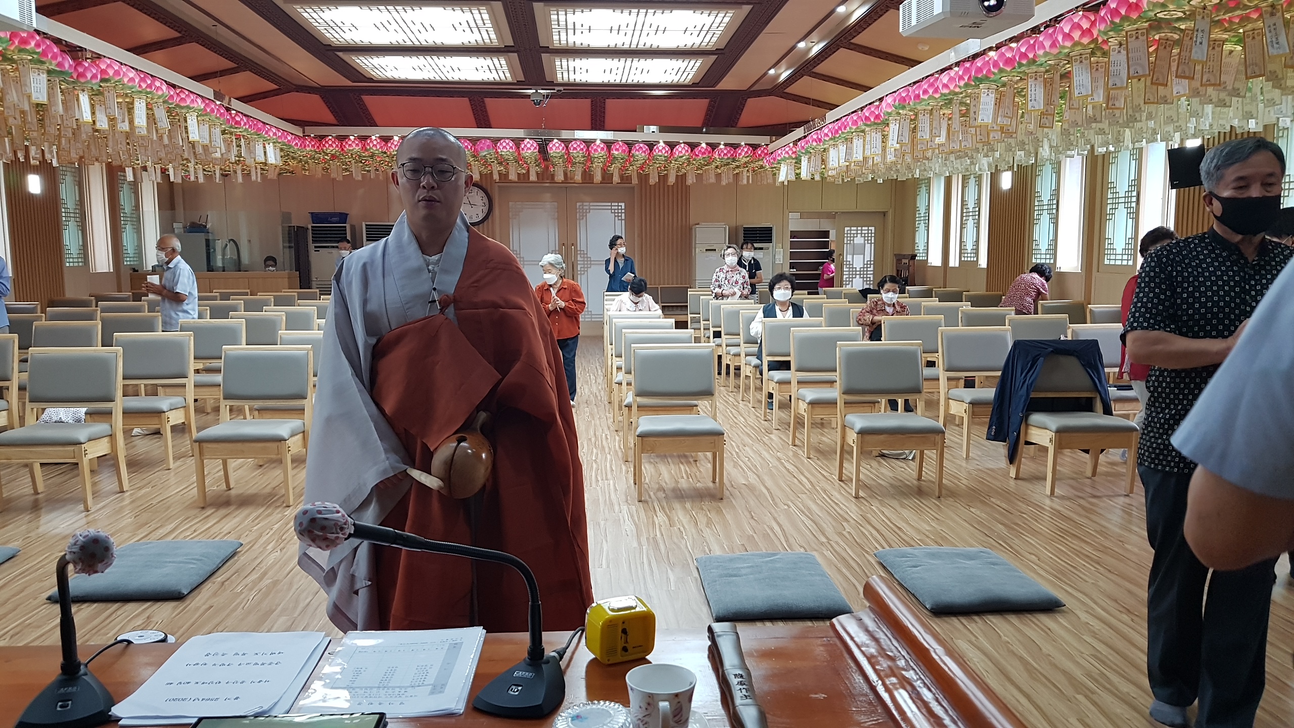 코로나에 대한 예방대책과 절차도 철저하다. 용산구청에서 종교집회에 대하여 민감하게 관심을 가지고 있어 출입시에 절차를 엄격하게 지킨다. 체온측정을 하고 자필로 연락처를 기록하며 시전입력된 QR코드가 있으면 찍은 후 입장한다. 법당내에 의자도 띄엄띄엄 거리두기를 유지해 배치해 두었다. 창문은 열어두어 환기가 되게 하고 전부 마스크를 착용했다. 법회 후에 공양도 하지 않고 백설기떡을 나눠주어 이 지역을 벗어 나가서 먹도록 했다.