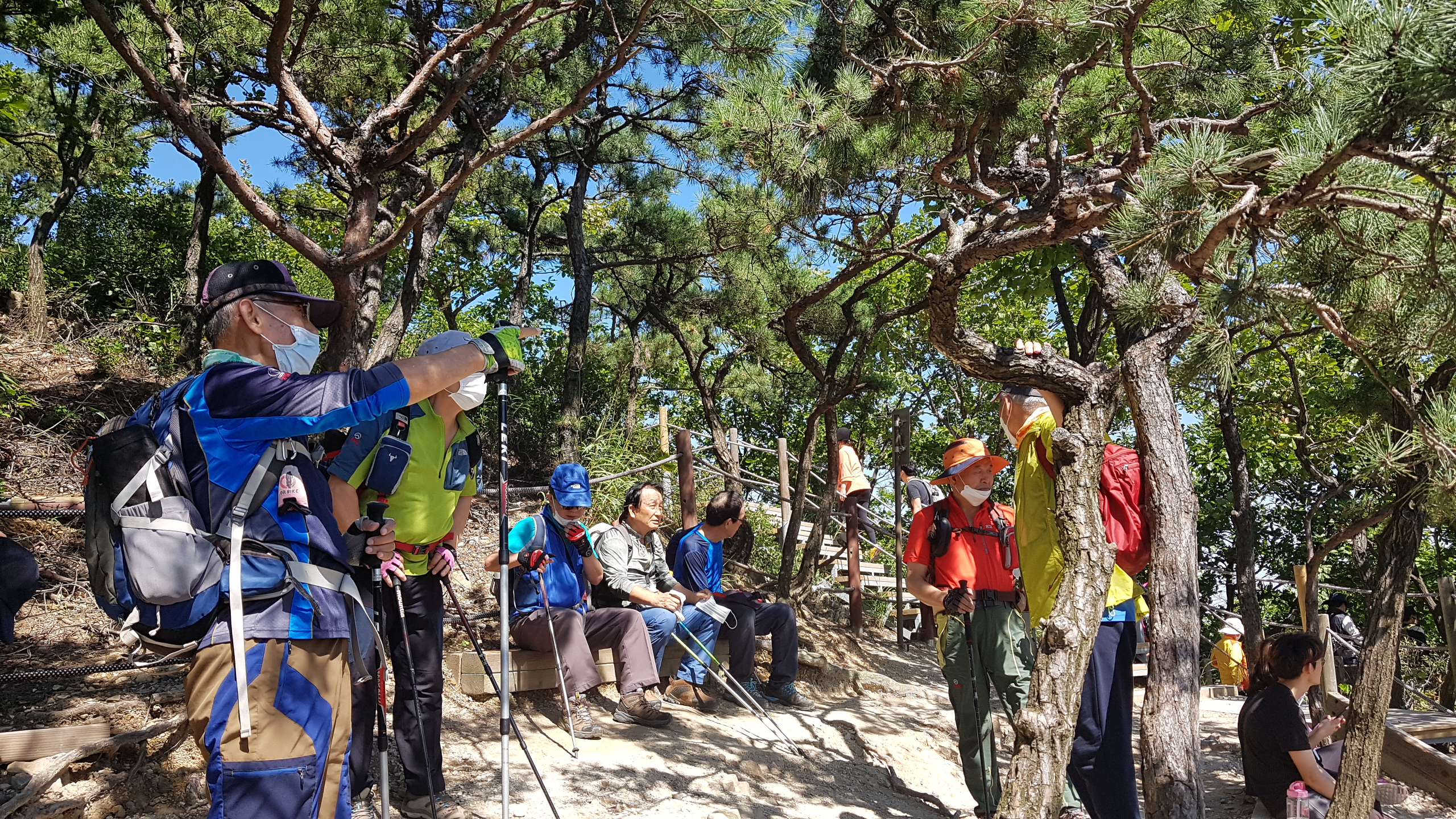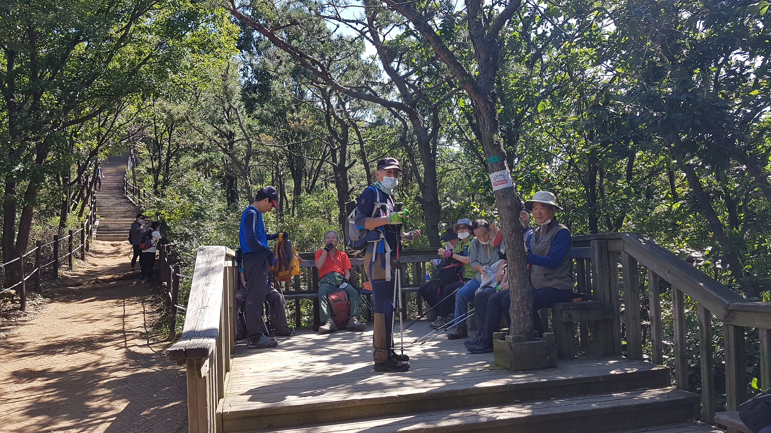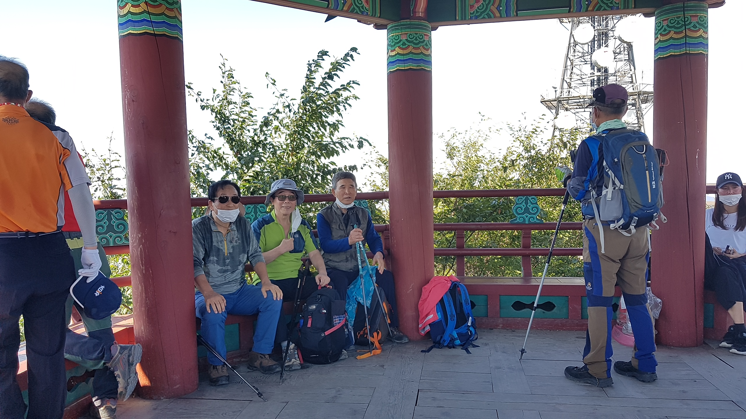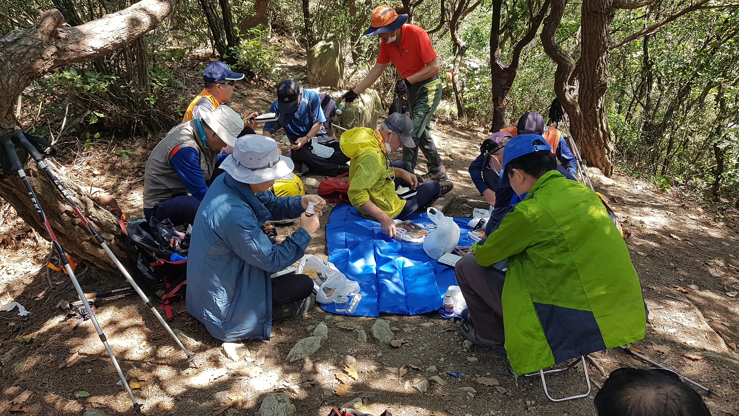 정상 바로 뒤 소나무 숲속에서 도시락으로 점심식사. 코로나 덕분에 야외 picnic 분위기이다.