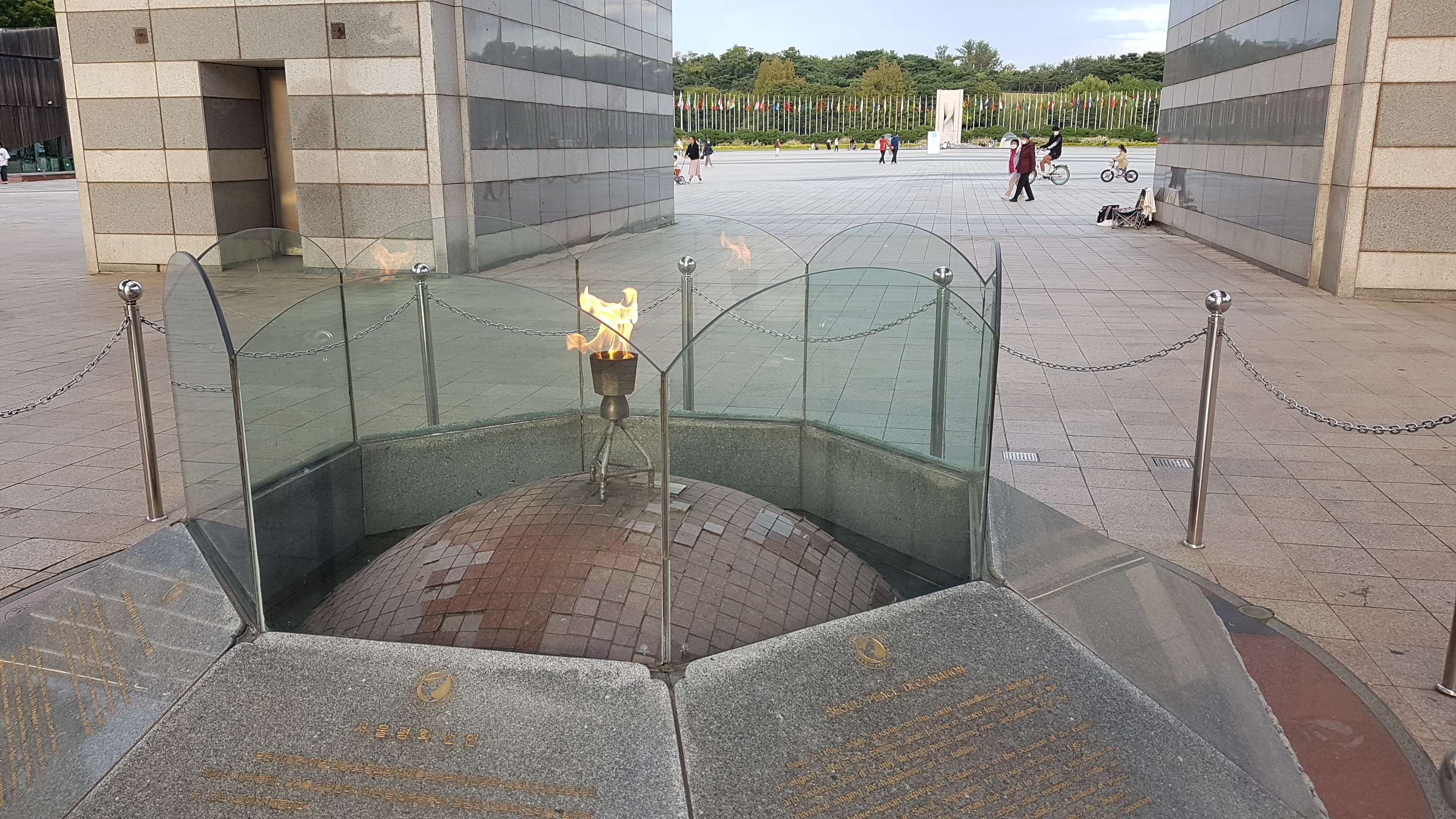 성화가 계속 타오르고 있는 평화의 문을 지나