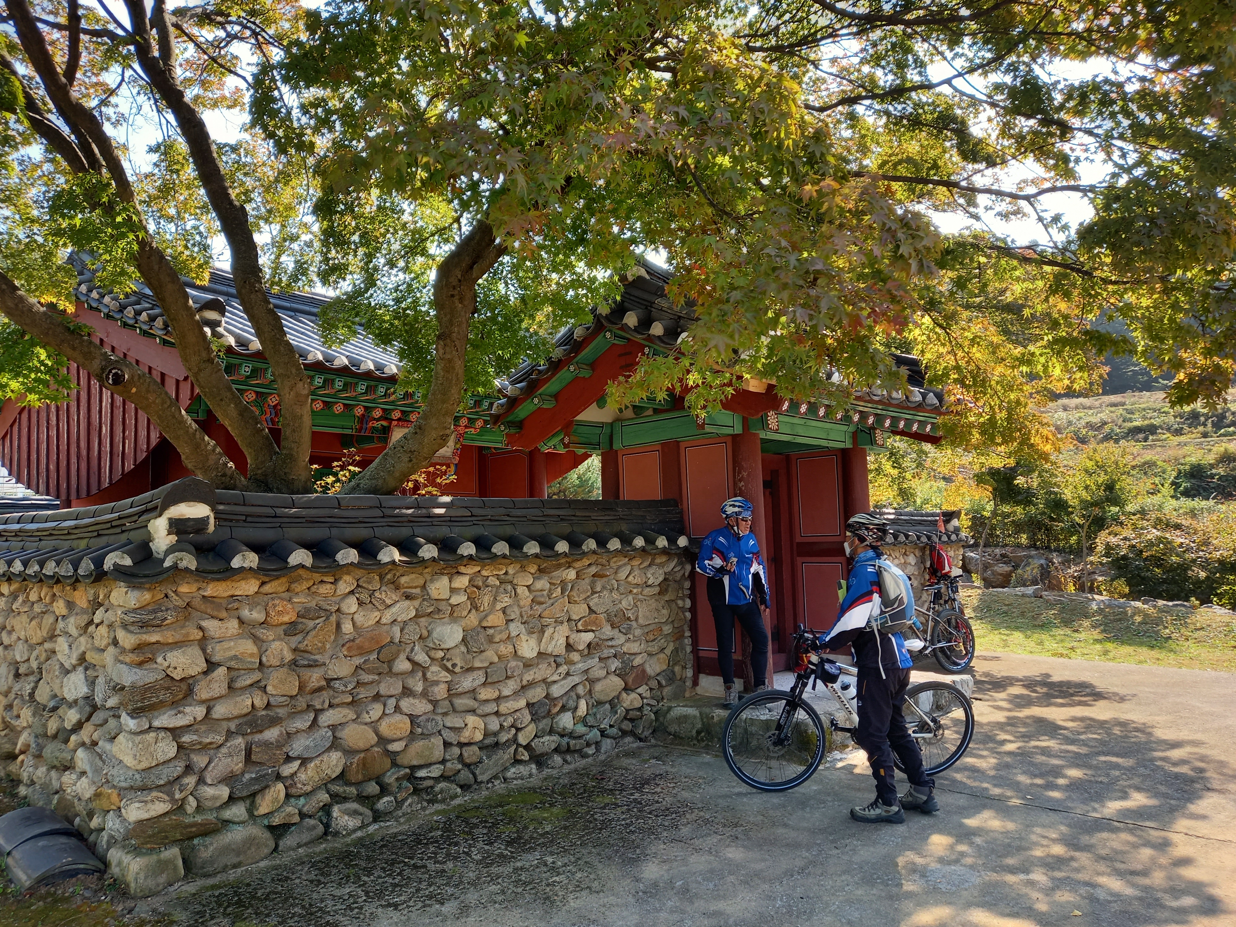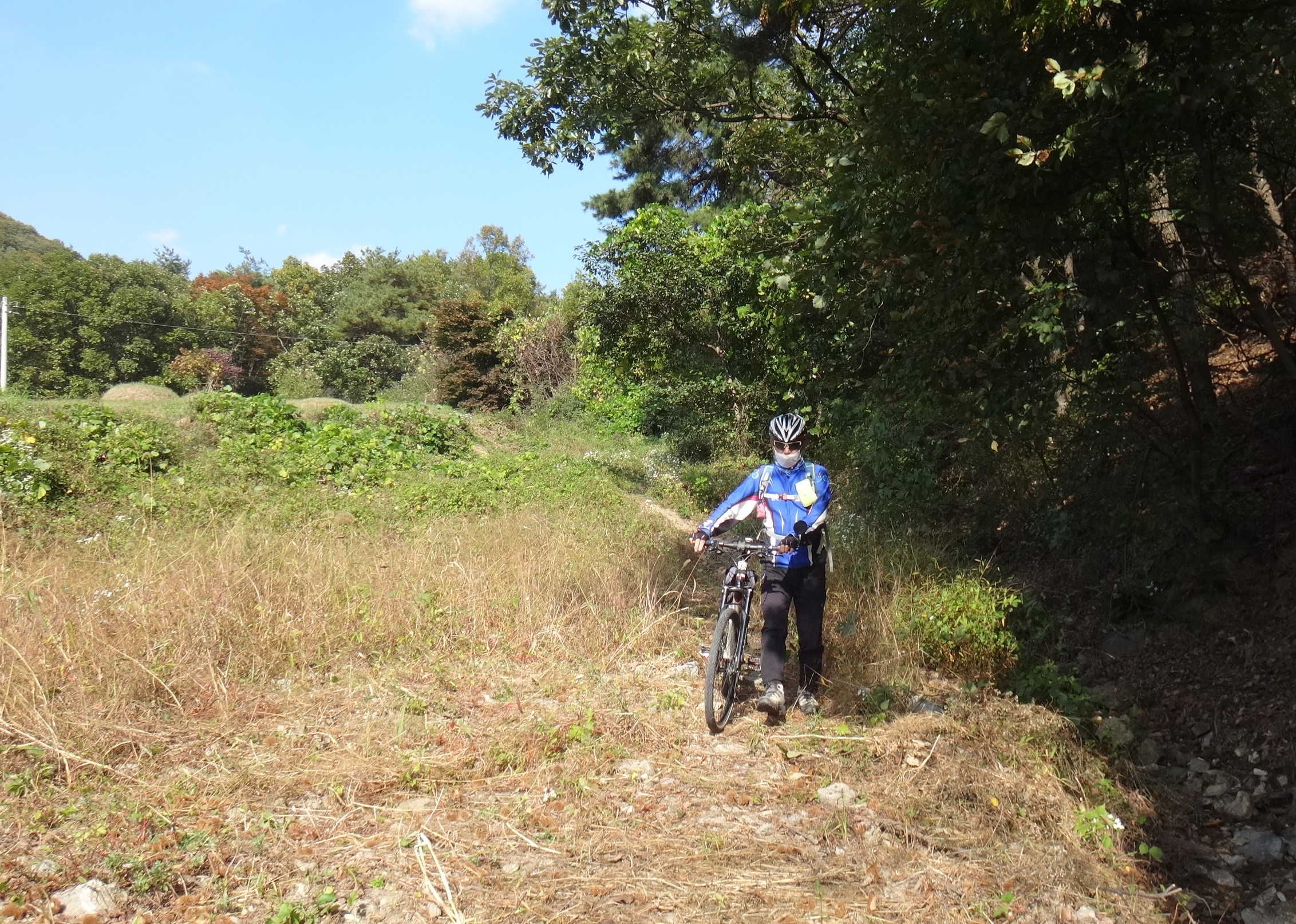 강변이나 개천을 따라 난 자전거길은 대체로 평탄하기도 하고 전용도로로 잘 가꾸어져 있지만 역사문화탐방에 나서는 길은 여러 형태의 길을 지나야 한다. 체력단련으로 보면 순탄한 길을 쌩쌩 달리는게 좋지만 우리는 특별한 친구 덕분에 '덕질' 라이딩 위주로 하고 있다. 대동여지도의 김정호선생 못지 않은 대가가 있다. IT의 도움까지 받아 구글지도와 입체영상 등을 통해 도상연구로 길을 찾아내어 머릿속으로 이미지를 그리고 현장에서 앞장서 대열을 이끌어 간다. 연구한 이미지가 하나하나 눈앞에 그대로 현실에 펼쳐지는 광경이 마치 비디오화면을 틀어놓고 가는 듯하지 않겠나 싶다. 길이 끝나고 막힐만한 지점에 묘지 뒤로 풀밭길 100여m가 이어지는 기막힌 길찾기까지 감탄사가 절로 나온다.