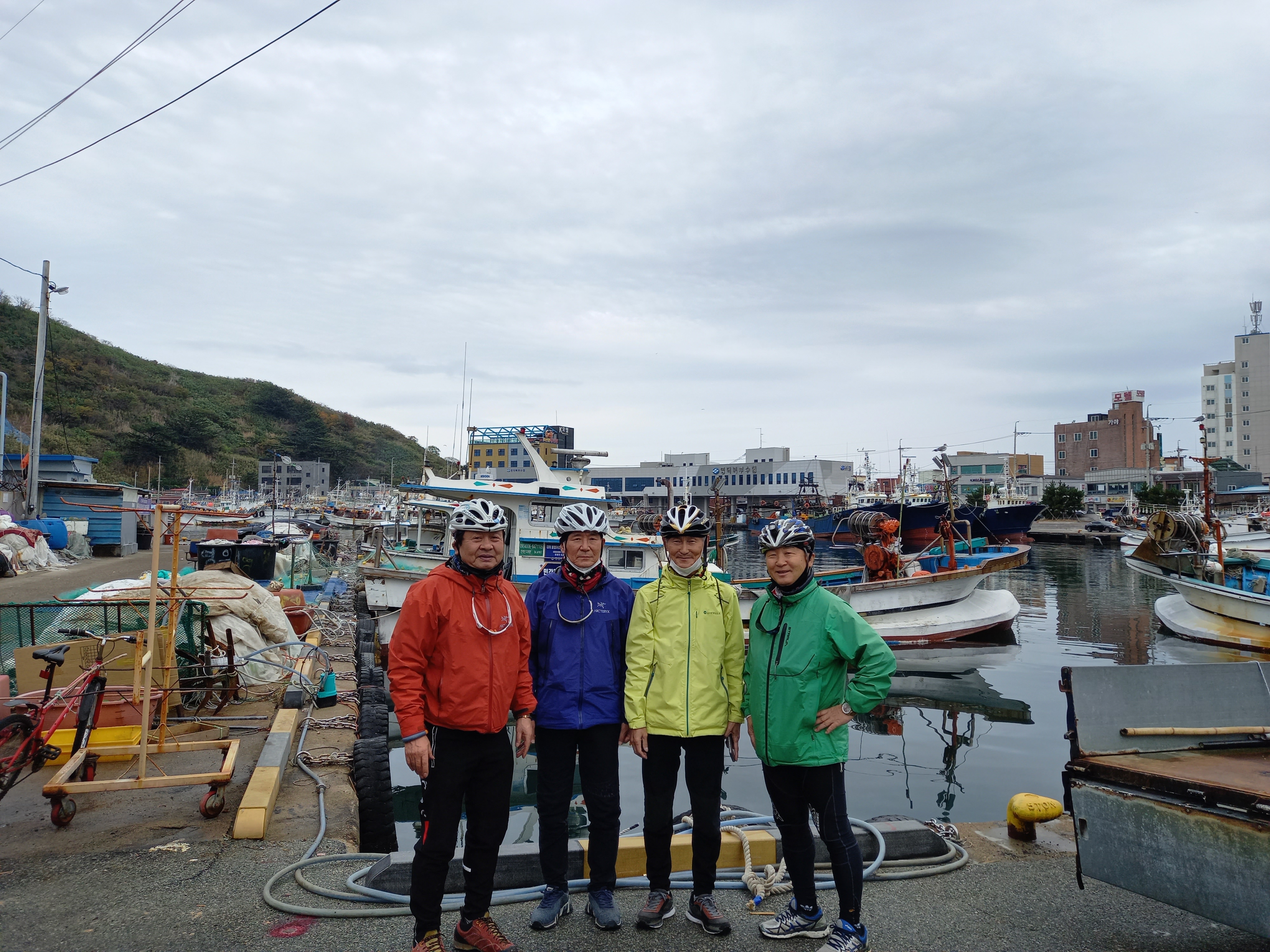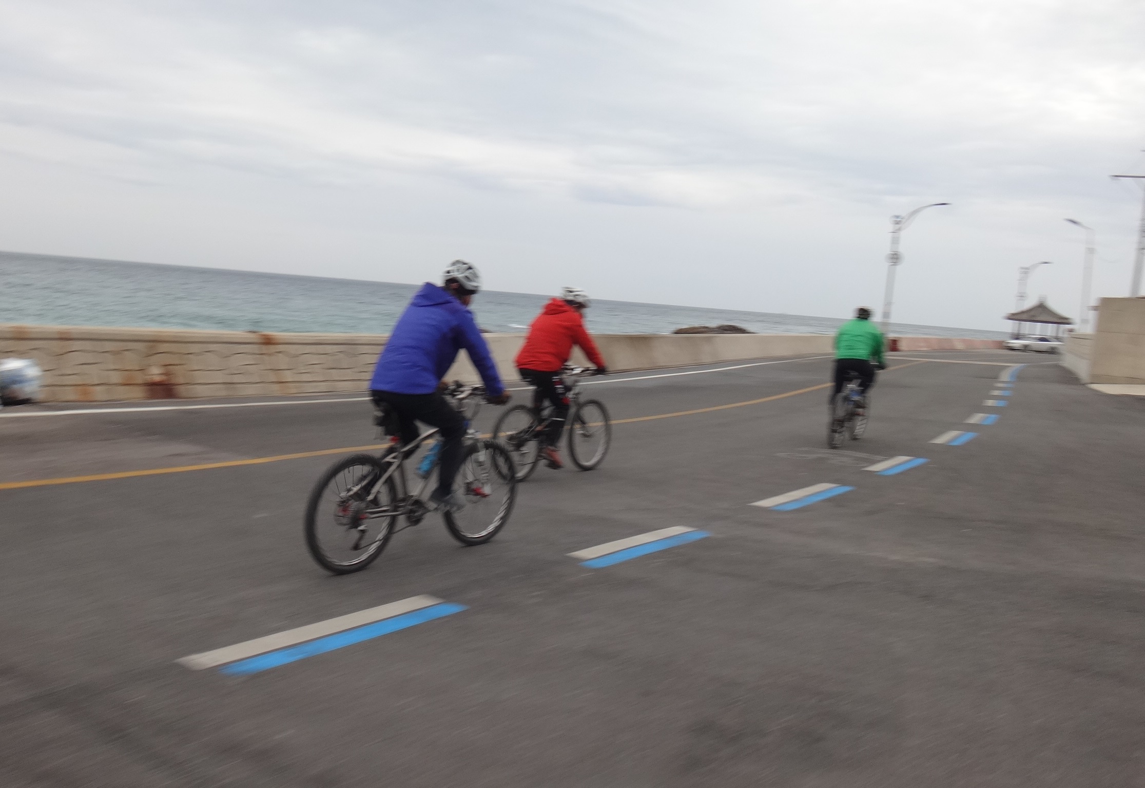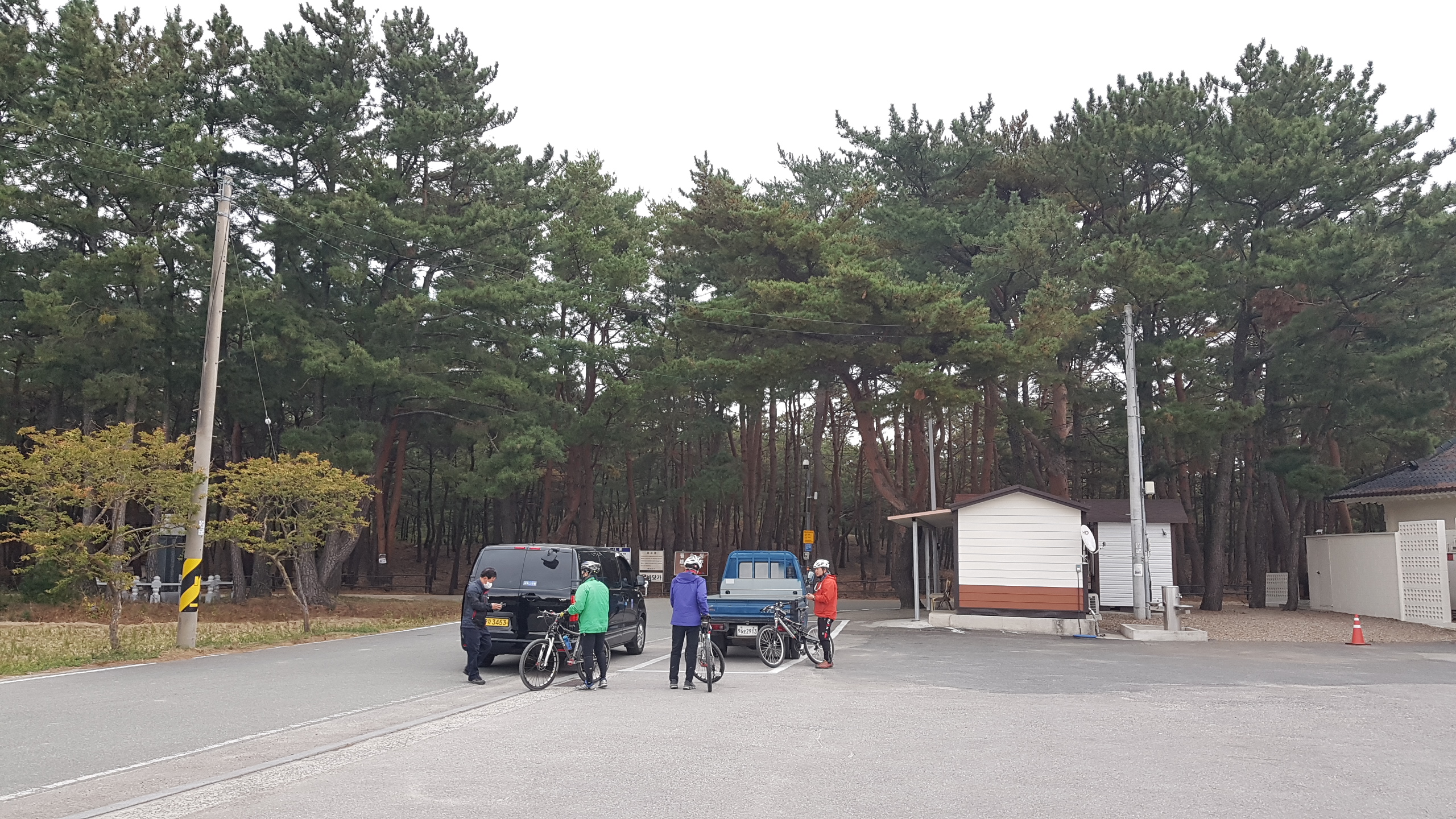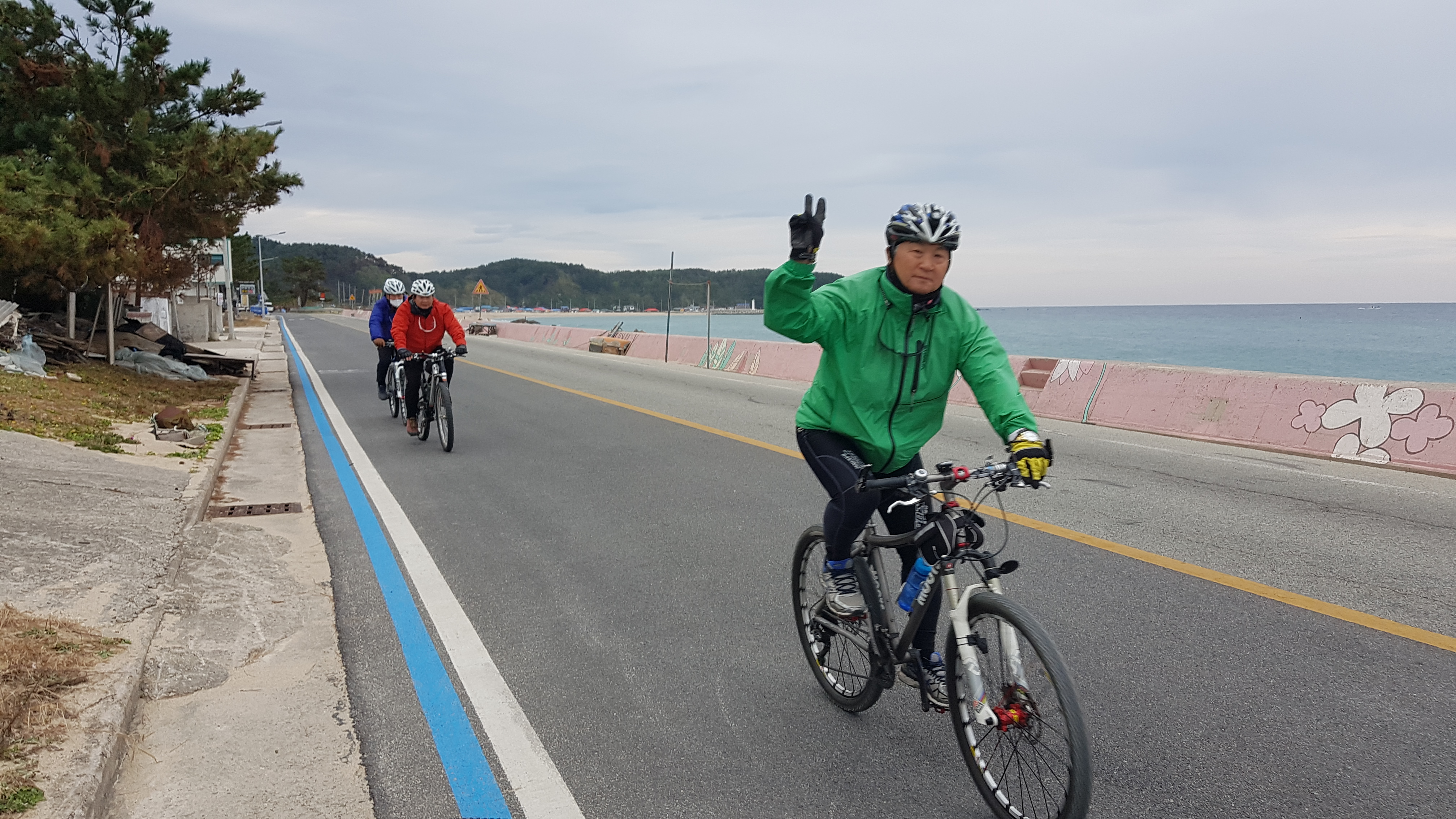 월송정으로 가는 중간 아침부페식당에서 간단한 식사를 하고 바닷가 월송정을 돌아본 후 소나무 숲에서부터 오늘의 라이딩을 시작했다. 곧이어 시원스런 바닷길이 시작된다. 어제는 단풍 산길이고 오늘은 전혀 다른 분위기의 바닷길이다. 울진에서 영덕쪽 남쪽으로 내려가는 길이라 왼쪽으로는 망망대해 동해바다가 계속 펼쳐지고 모래사장이나 바위절벽과 해수욕장, 포구들이 이어지는 멋진 절경이다. 서해안에 비해 물도 주변지역도 다 깔끔하고 깨끗하다.