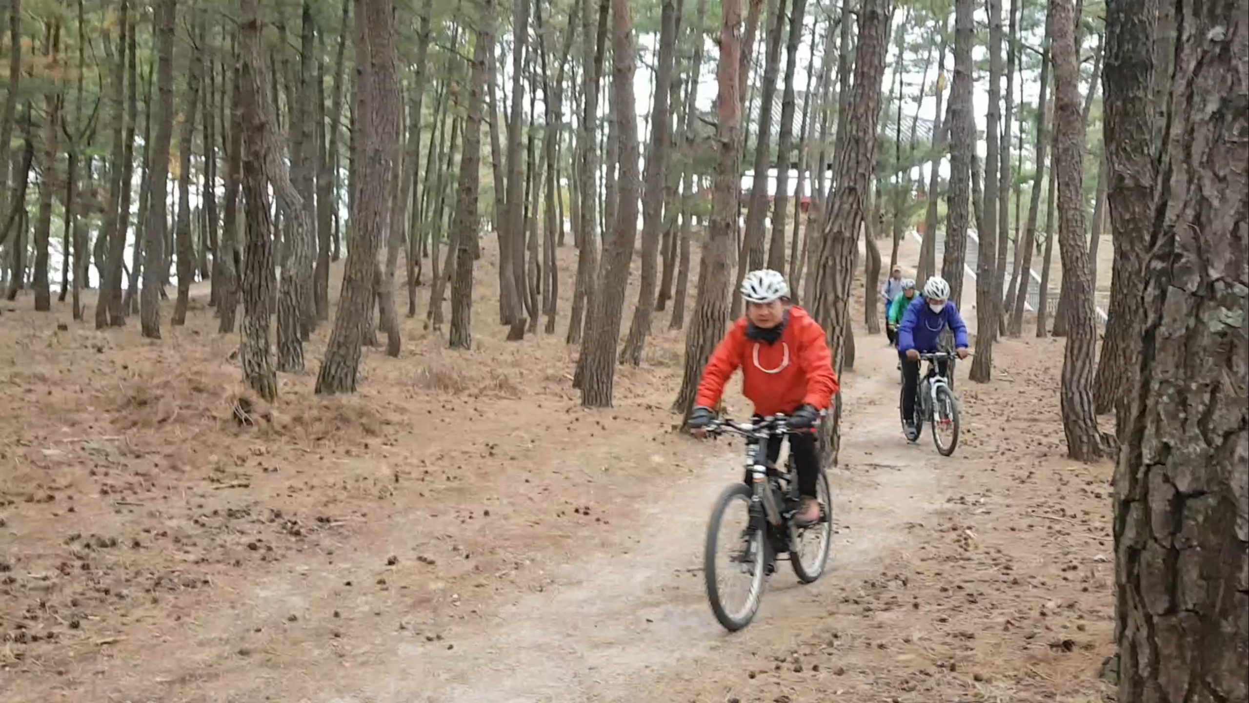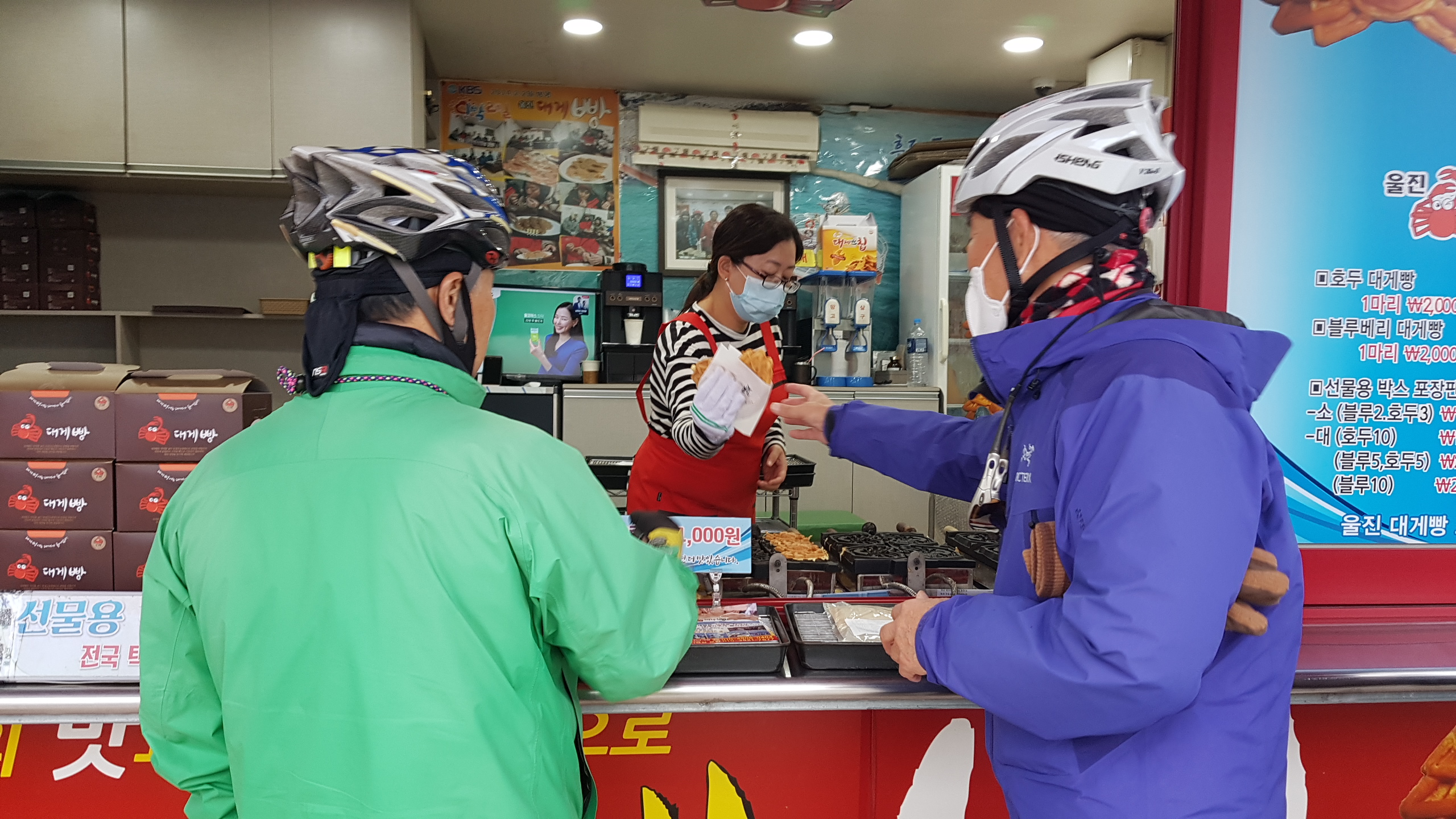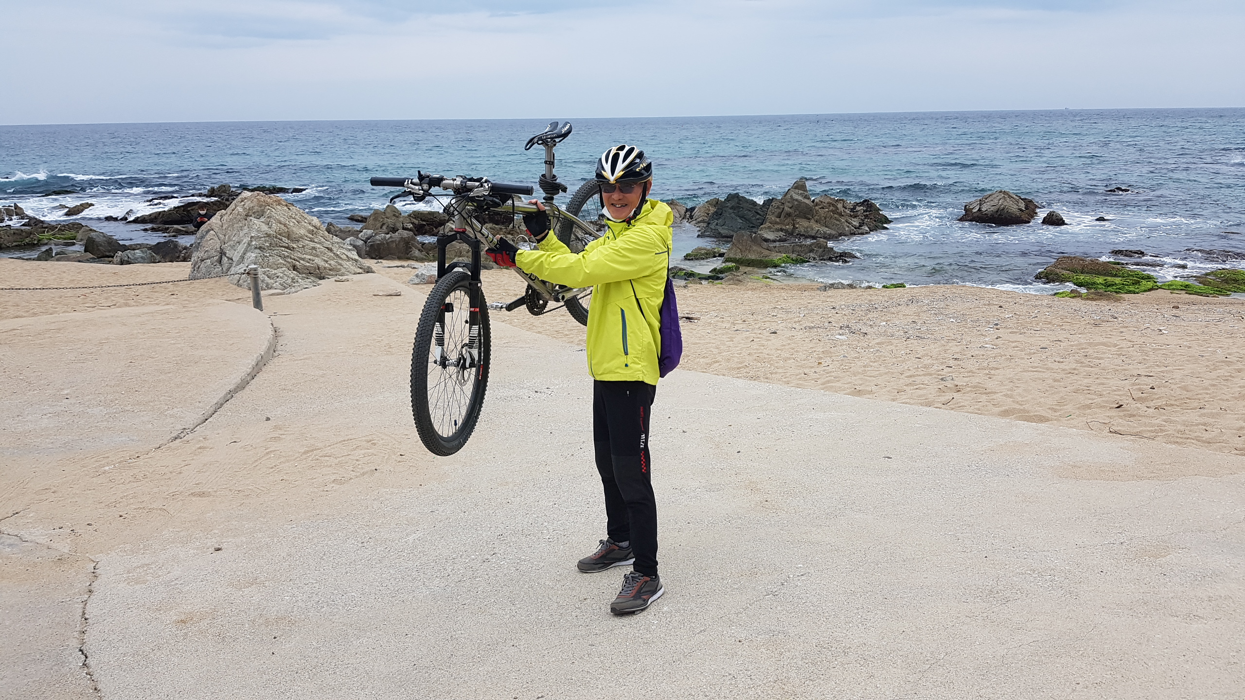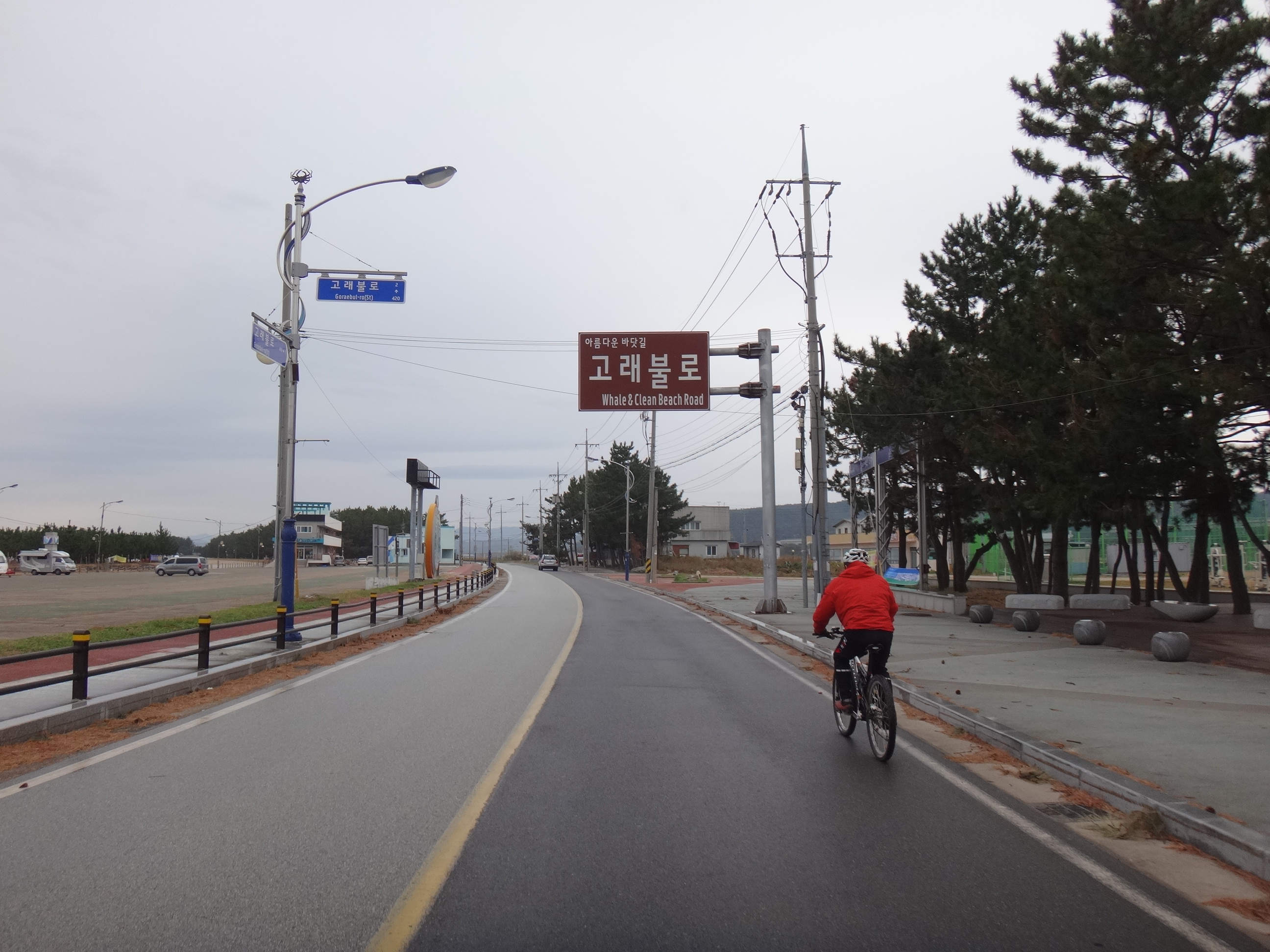 월송정으로 가는 중간 아침부페식당에서 간단한 식사를 하고 바닷가 월송정을 돌아본 후 소나무 숲에서부터 오늘의 라이딩을 시작했다. 곧이어 시원스런 바닷길이 시작된다. 어제는 단풍 산길이고 오늘은 전혀 다른 분위기의 바닷길이다. 울진에서 영덕쪽 남쪽으로 내려가는 길이라 왼쪽으로는 망망대해 동해바다가 계속 펼쳐지고 모래사장이나 바위절벽과 해수욕장, 포구들이 이어지는 멋진 절경이다. 서해안에 비해 물도 주변지역도 다 깔끔하고 깨끗하다.