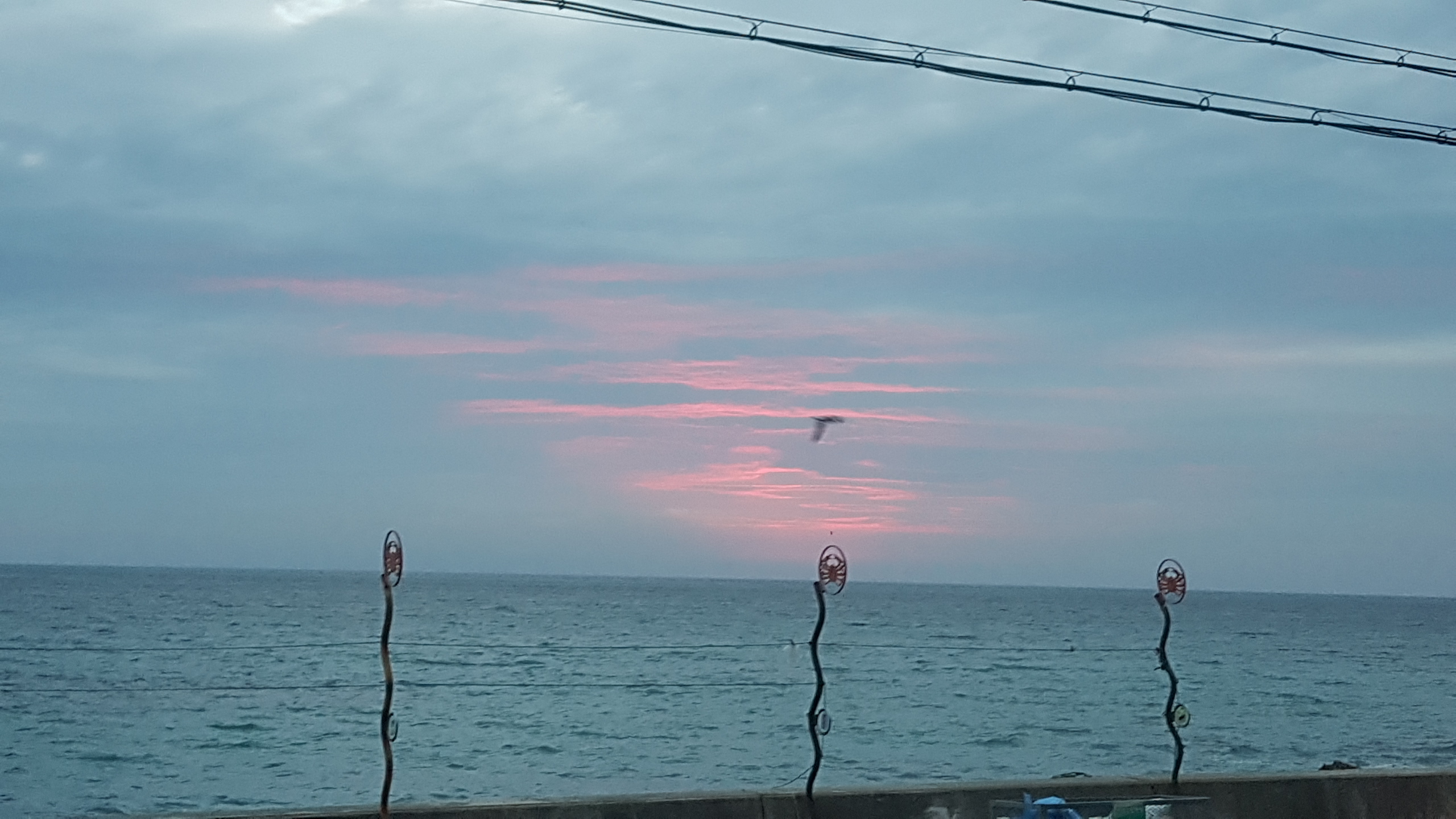 동해바다 파도가 철석이는 도로 하나 건너에 있는 바다쪽 펜션, 유리창 밖으로 넓은 바다가 내다보이는 숙소에서 파도소리를 들으며 잠에 들고 아침에는 구름사이 붉은 해의 기운을 보면서 일어났다.