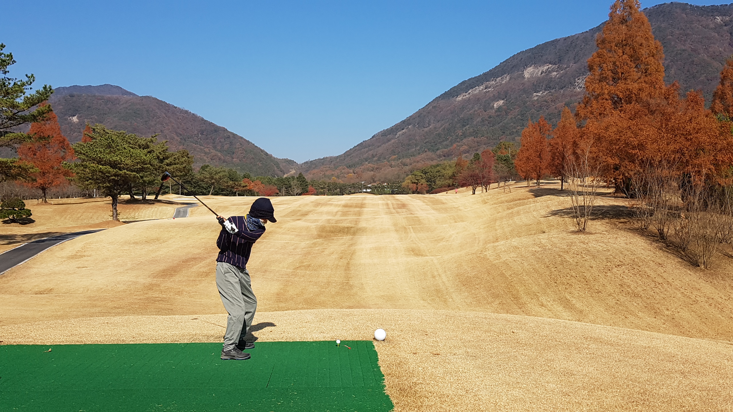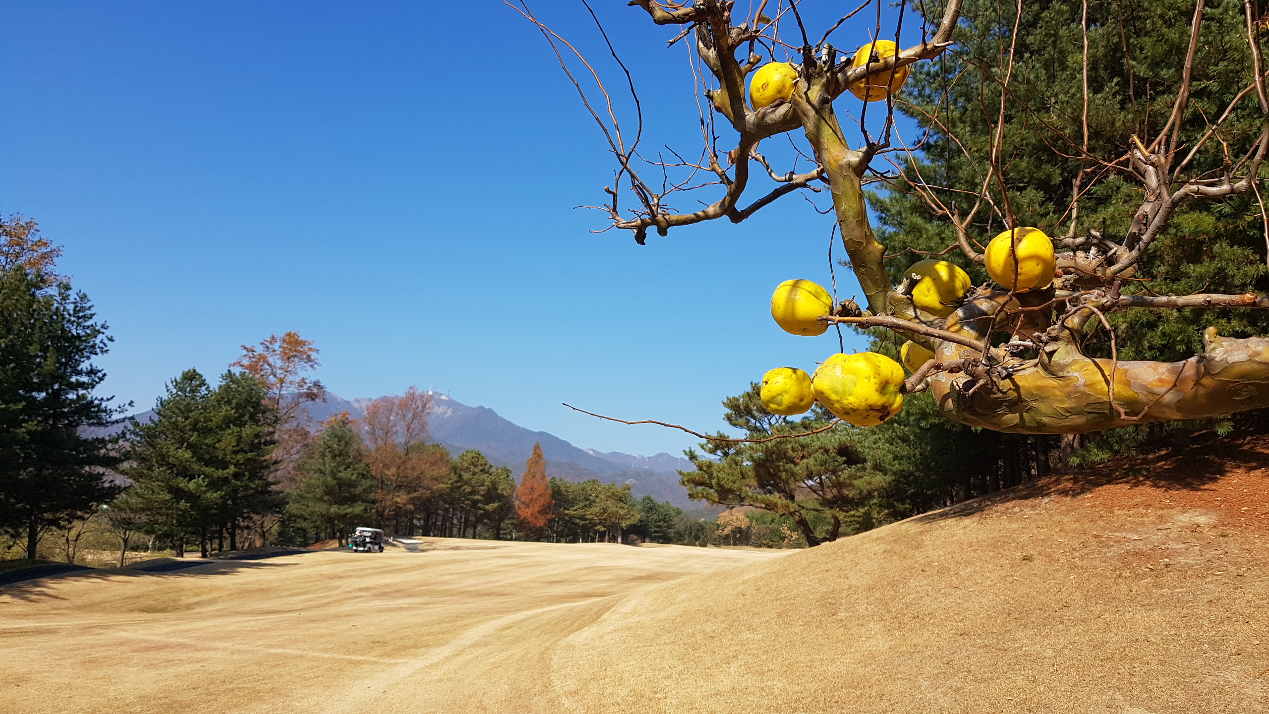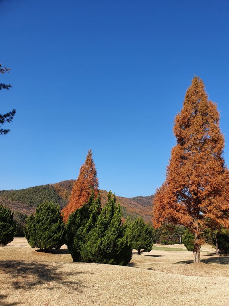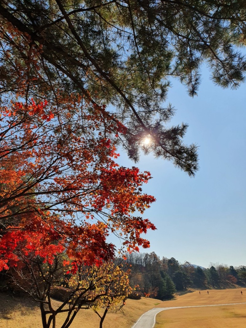 아침에 서리가 내리고 잔디와 그린이 얼어있다. 다행히 햇살이 비치면서 기온이 많이 올라가 낮에는 껴입은 옷으로 땀이 날 정도로 따스하다. 하늘은 전날처럼 구름한점 없이 쾌청하다. 늦가을의 붉은 단풍이 파아란 하늘을 배경으로 더욱 돋보인다.