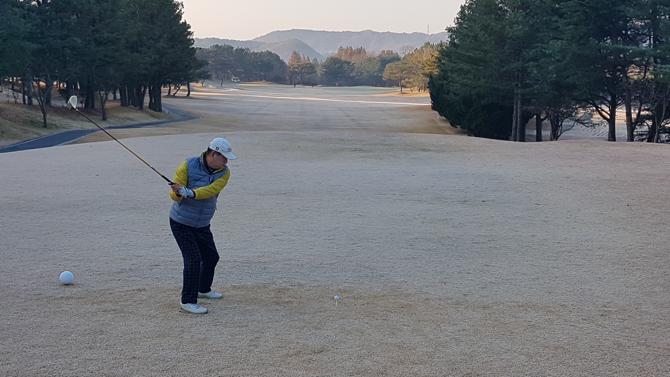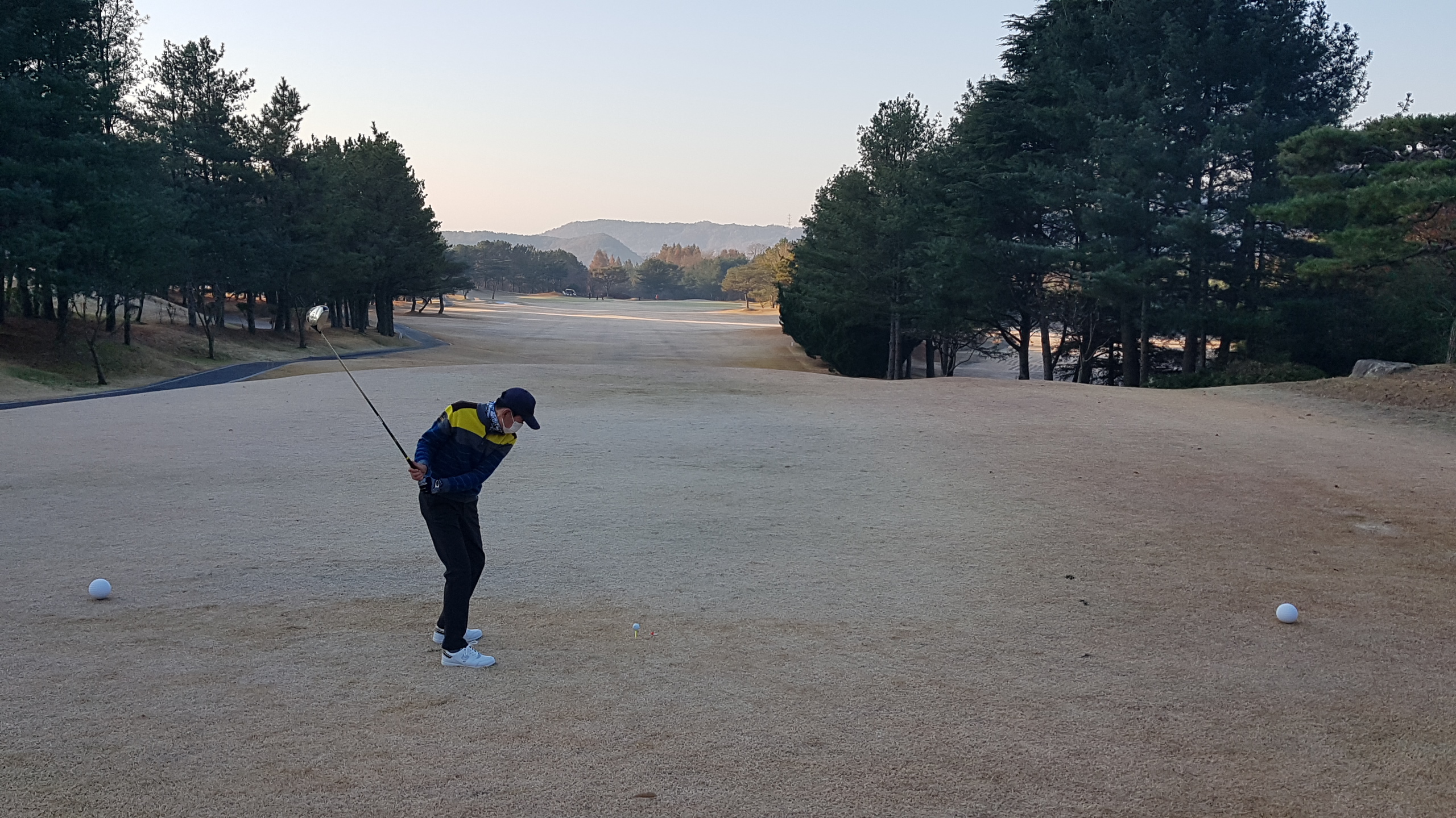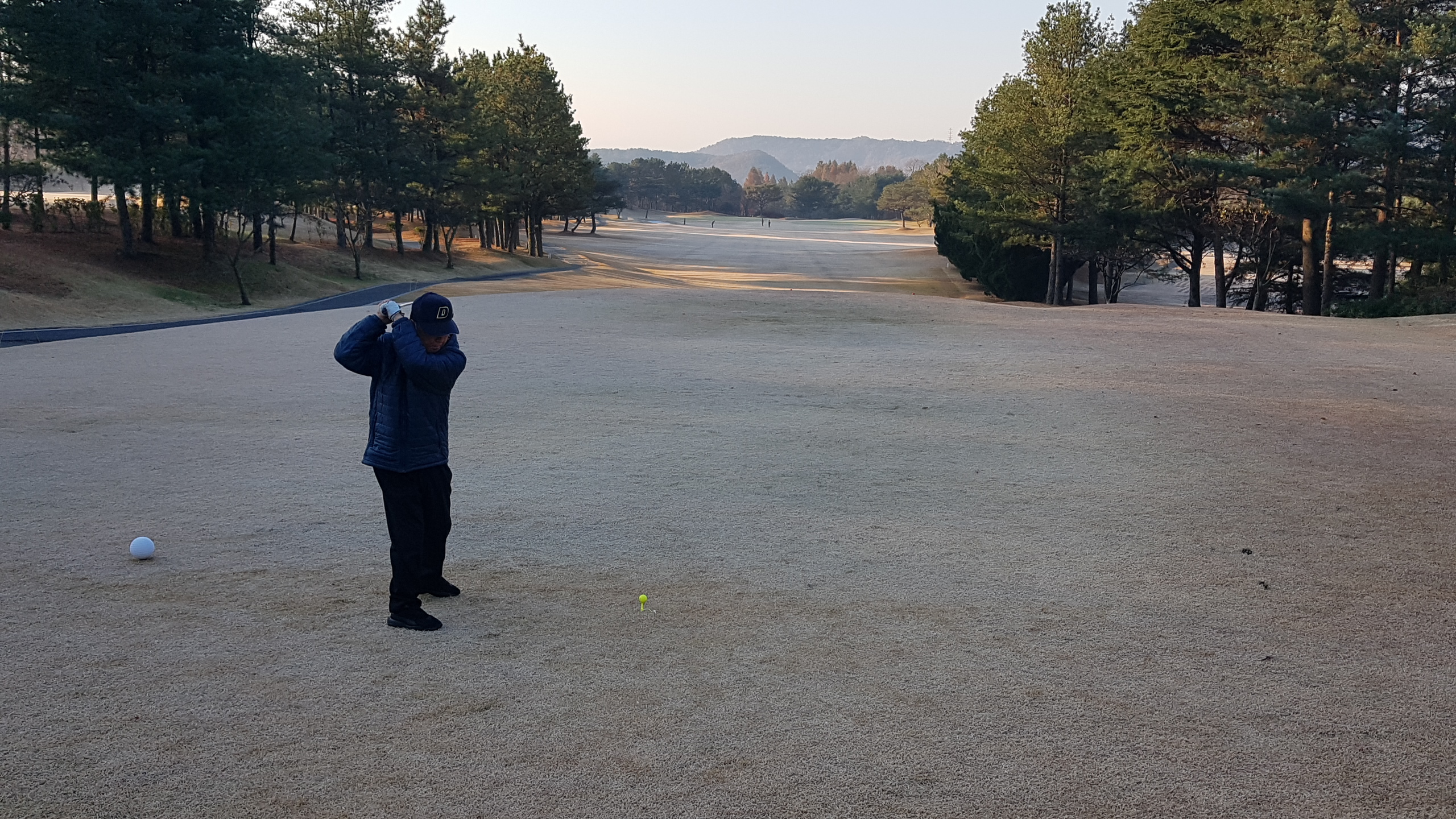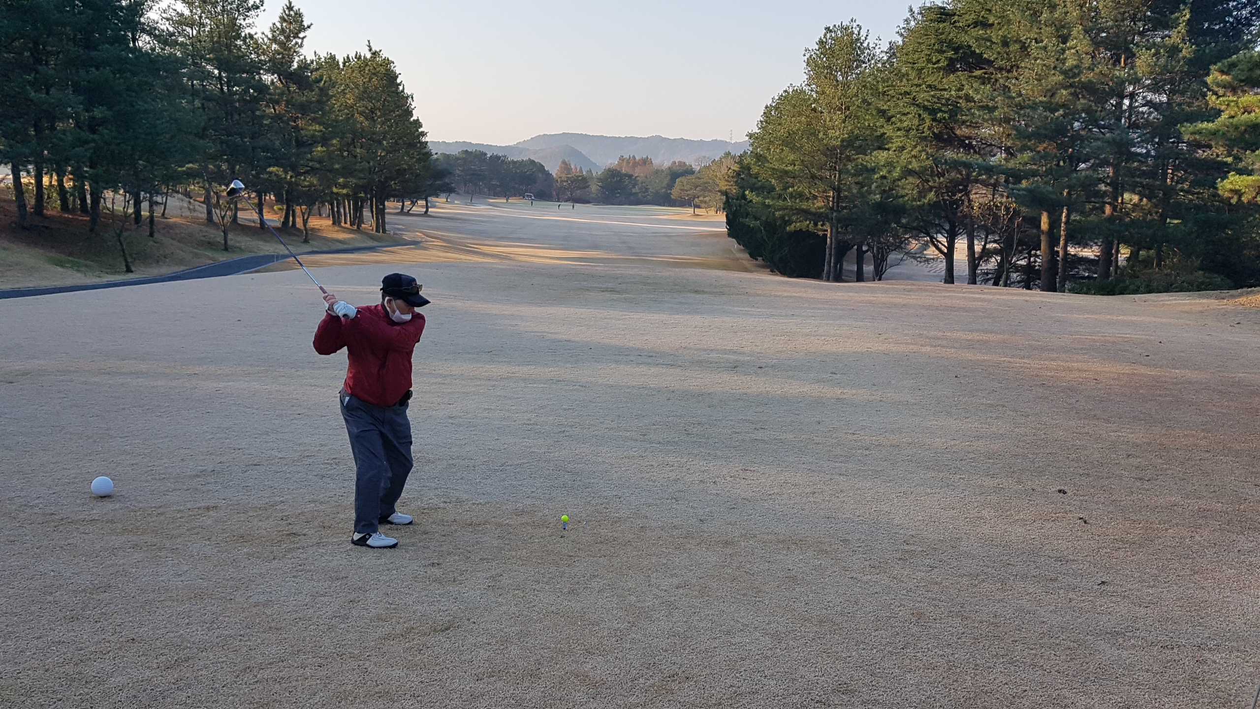아침에 서리가 내리고 잔디와 그린이 얼어있다. 다행히 햇살이 비치면서 기온이 많이 올라가 낮에는 껴입은 옷으로 땀이 날 정도로 따스하다. 하늘은 전날처럼 구름한점 없이 쾌청하다. 늦가을의 붉은 단풍이 파아란 하늘을 배경으로 더욱 돋보인다.