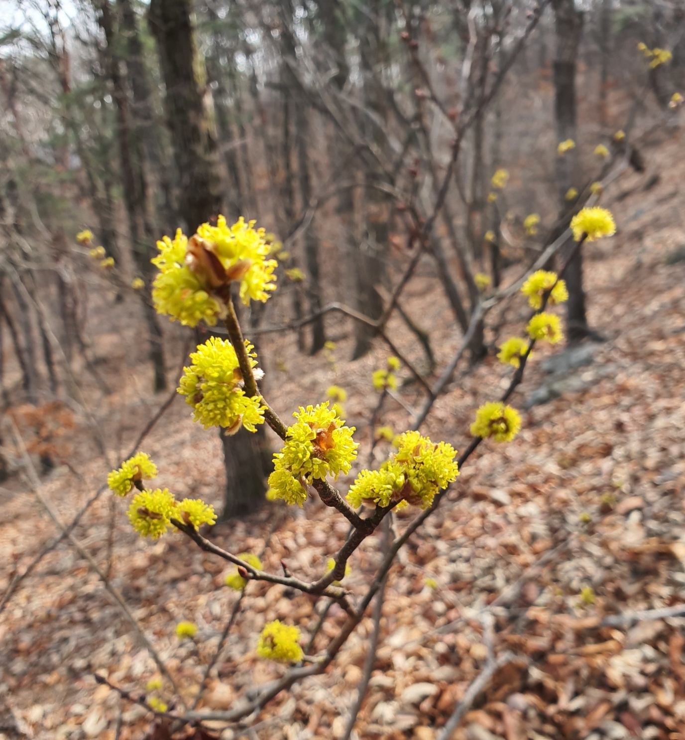 봄에 생강나무에 이런 꽃이 핀다.