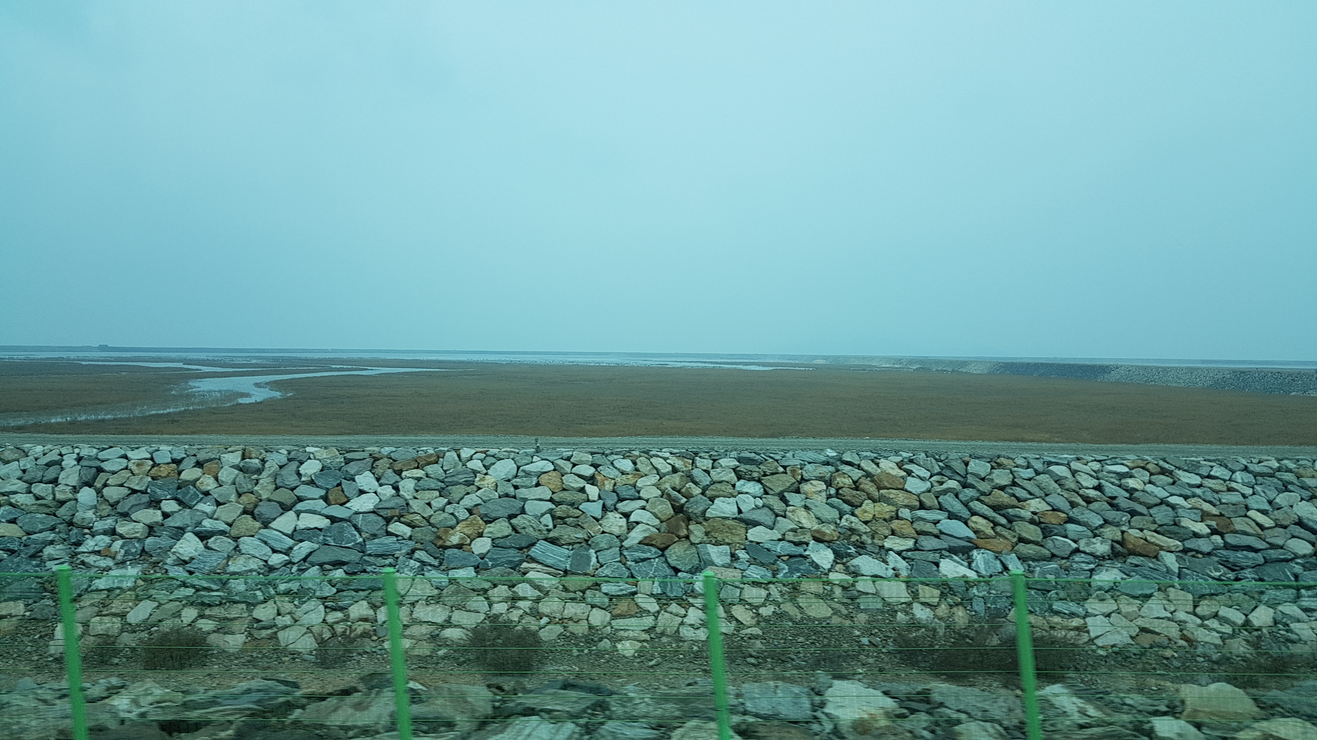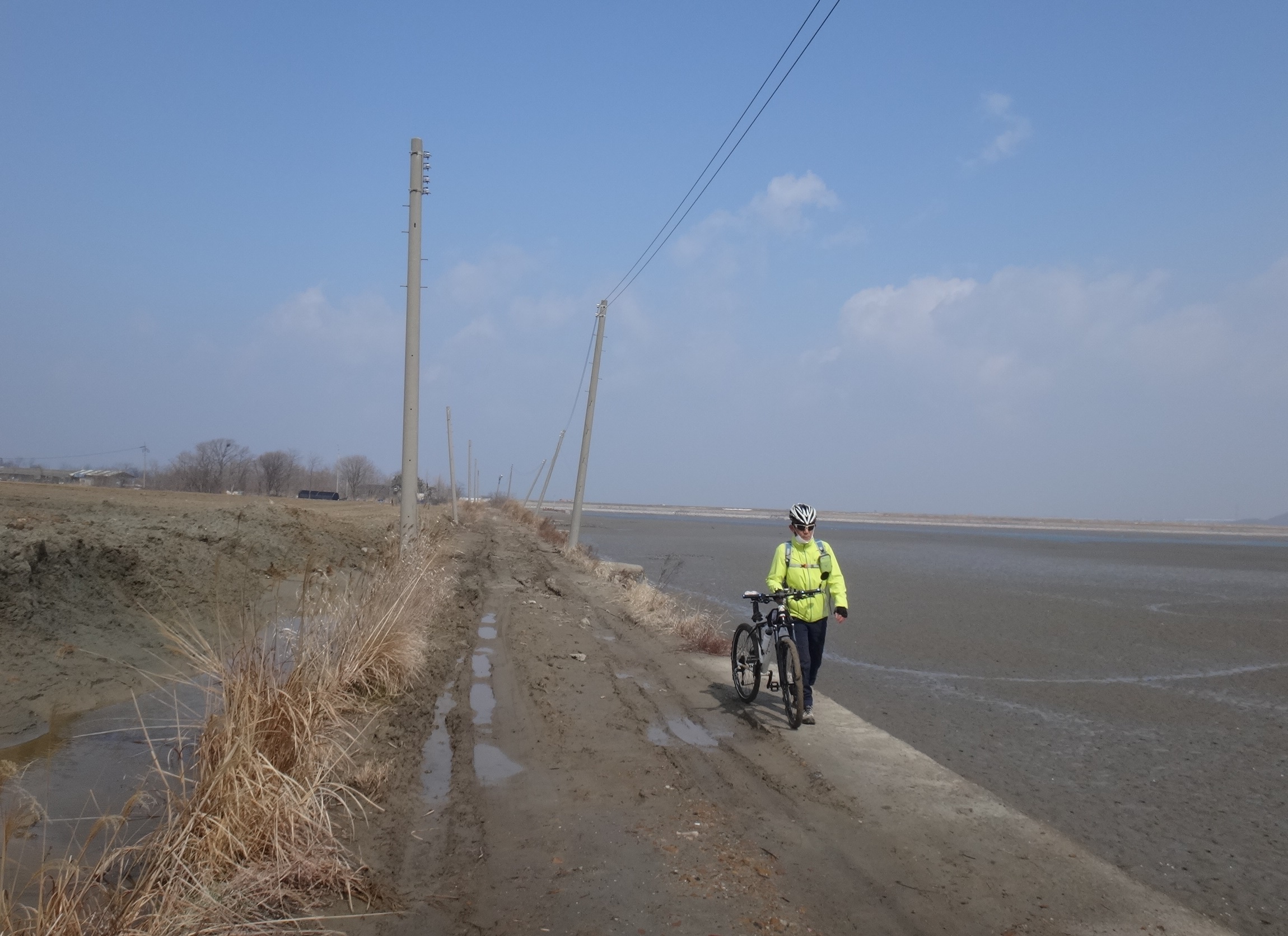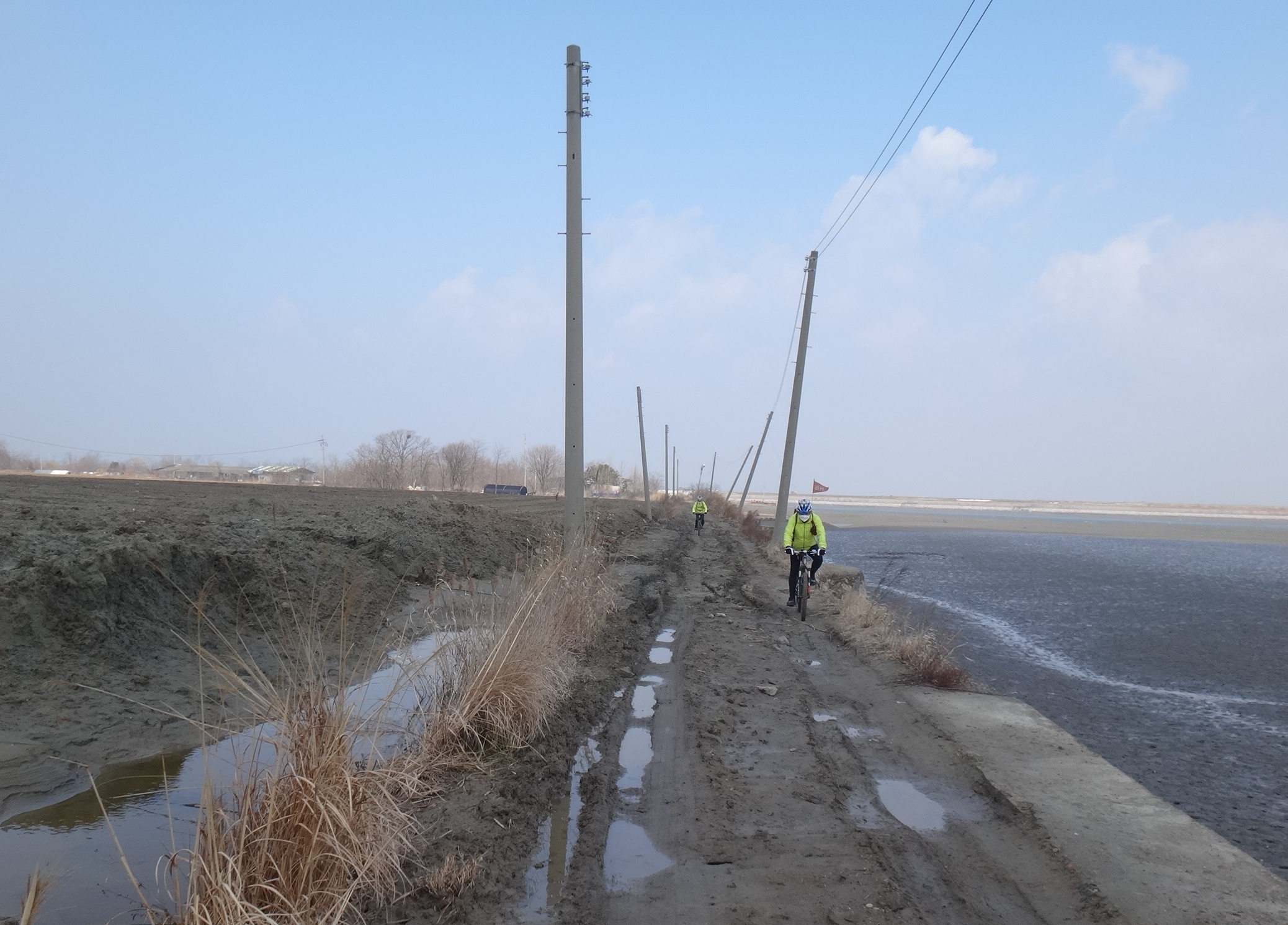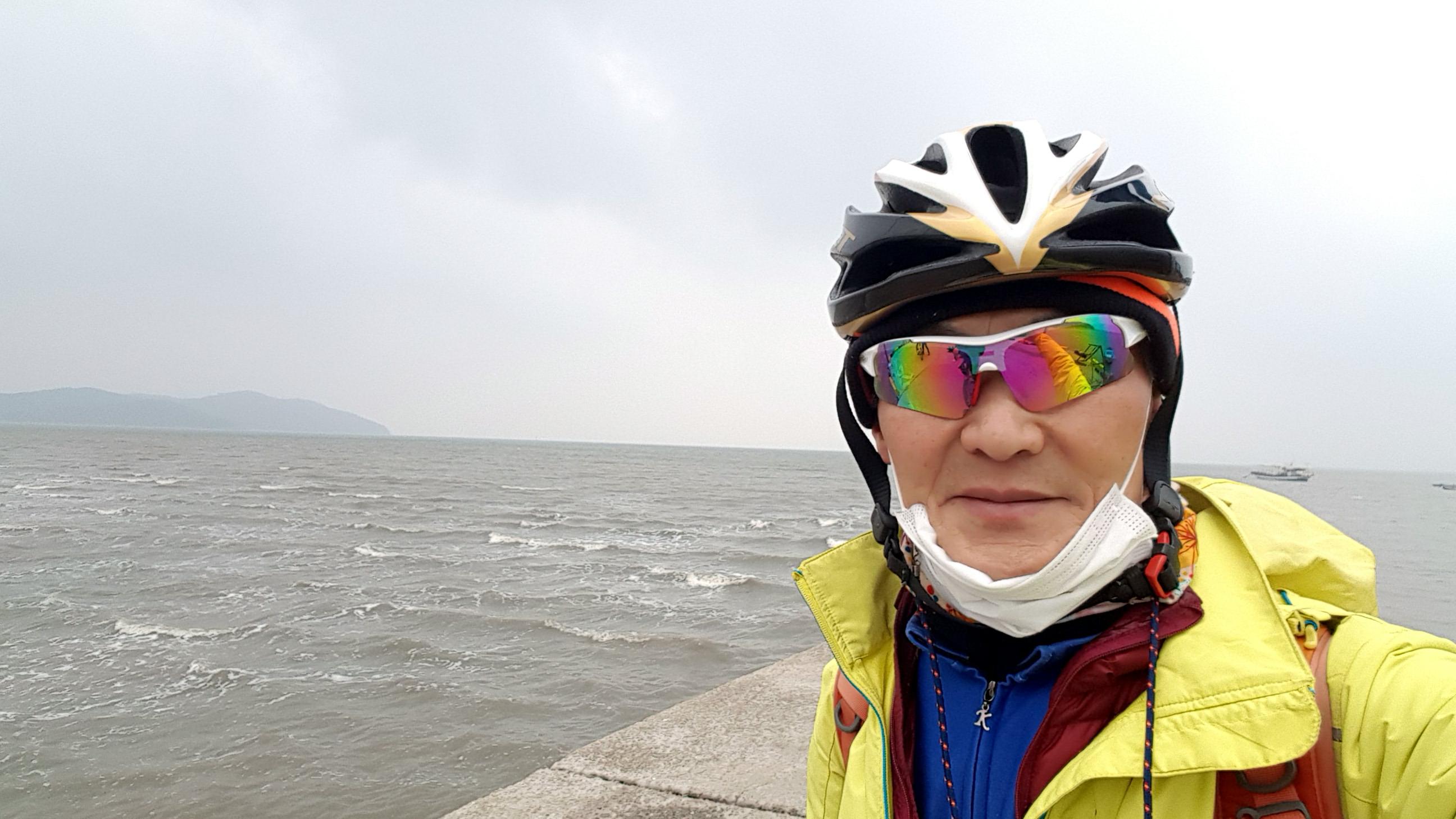 시속 10km정도의 거센 앞바람 헤치며 서쪽으로... 아무리 밟아도 앞으로 나아가지지 않아 허리를 숙이고 안간힘을 쓴다. 반대쪽에서 오는 일행들은 엄청 여유로워 보인다.