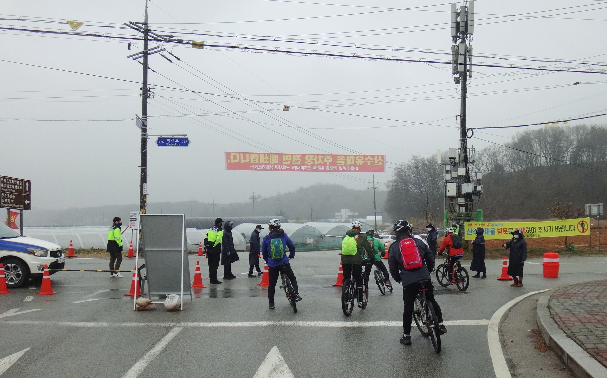 산수유마을 입구에서 경찰과 마을주민들이 차량출입을 못하게 막고 있으니 차들을 농로 길가에 쭉 세운다.