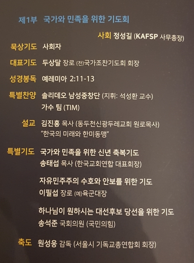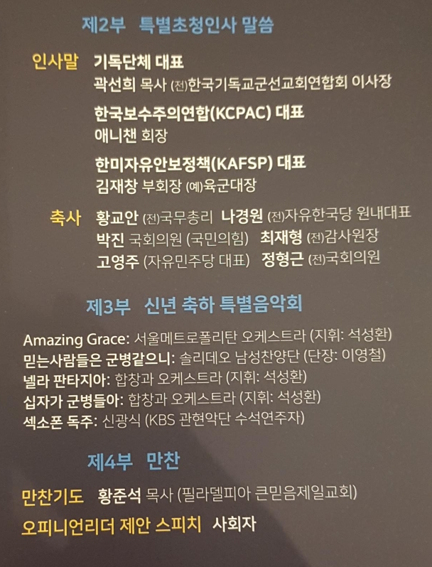 새해를 맞아 나라를 위한 기도회가 예비역 및 한국교회연합 주관으로 300여명의 애국활동가들과 군선교회, 기독교 주요인사들이 참석한 가운데 1.20(목) 15시부터 하얏트호텔에서 개최되었다.