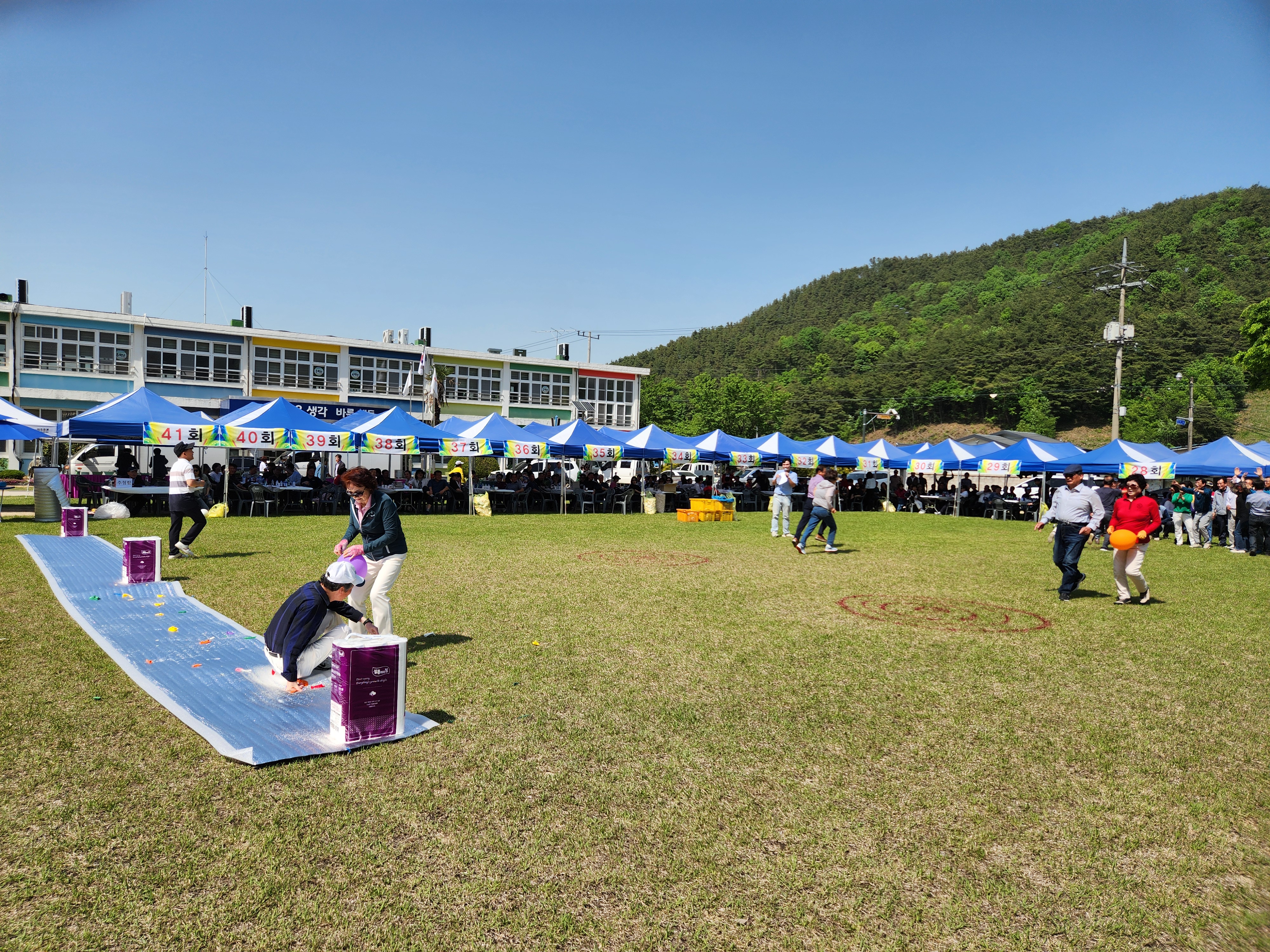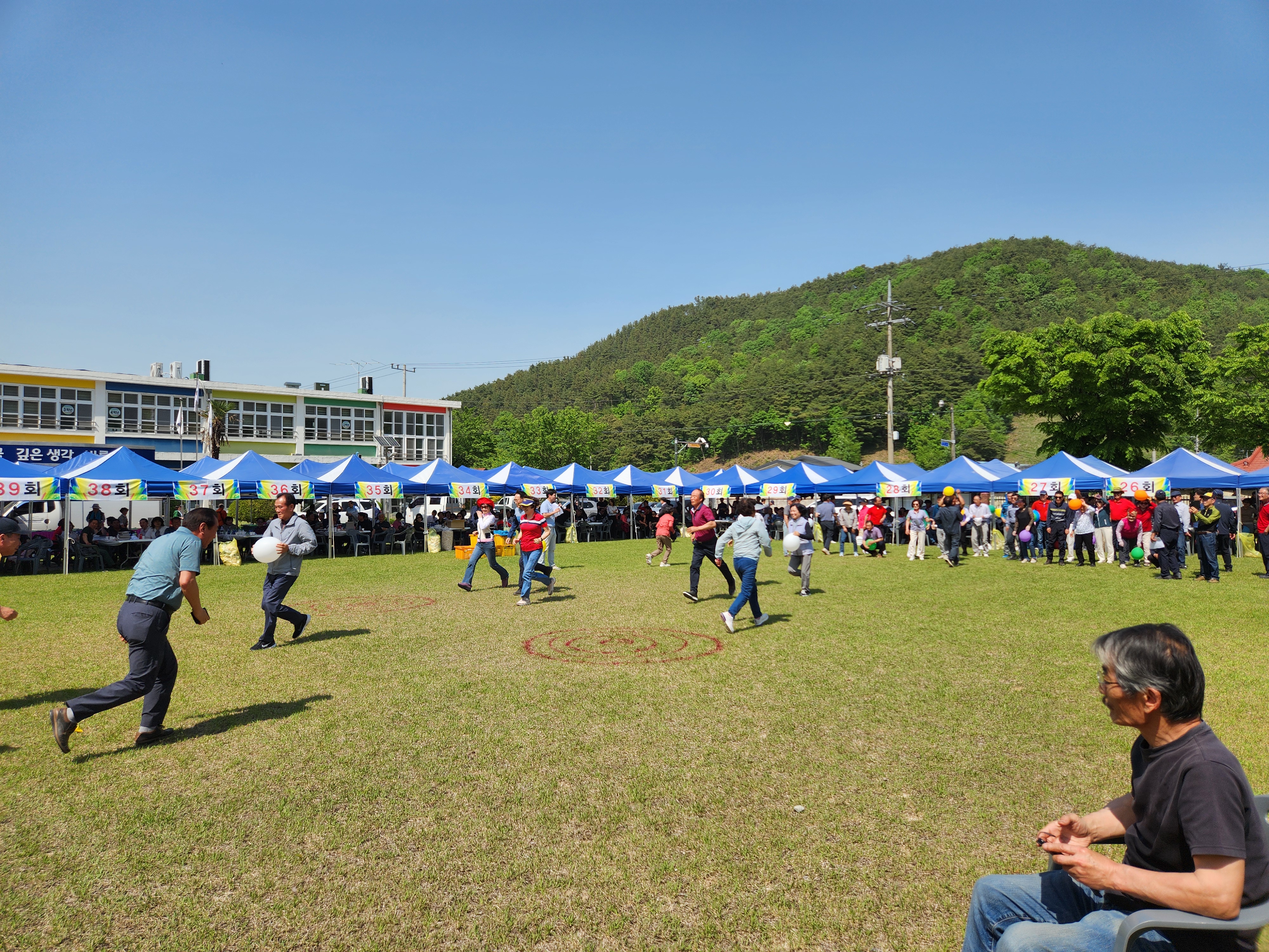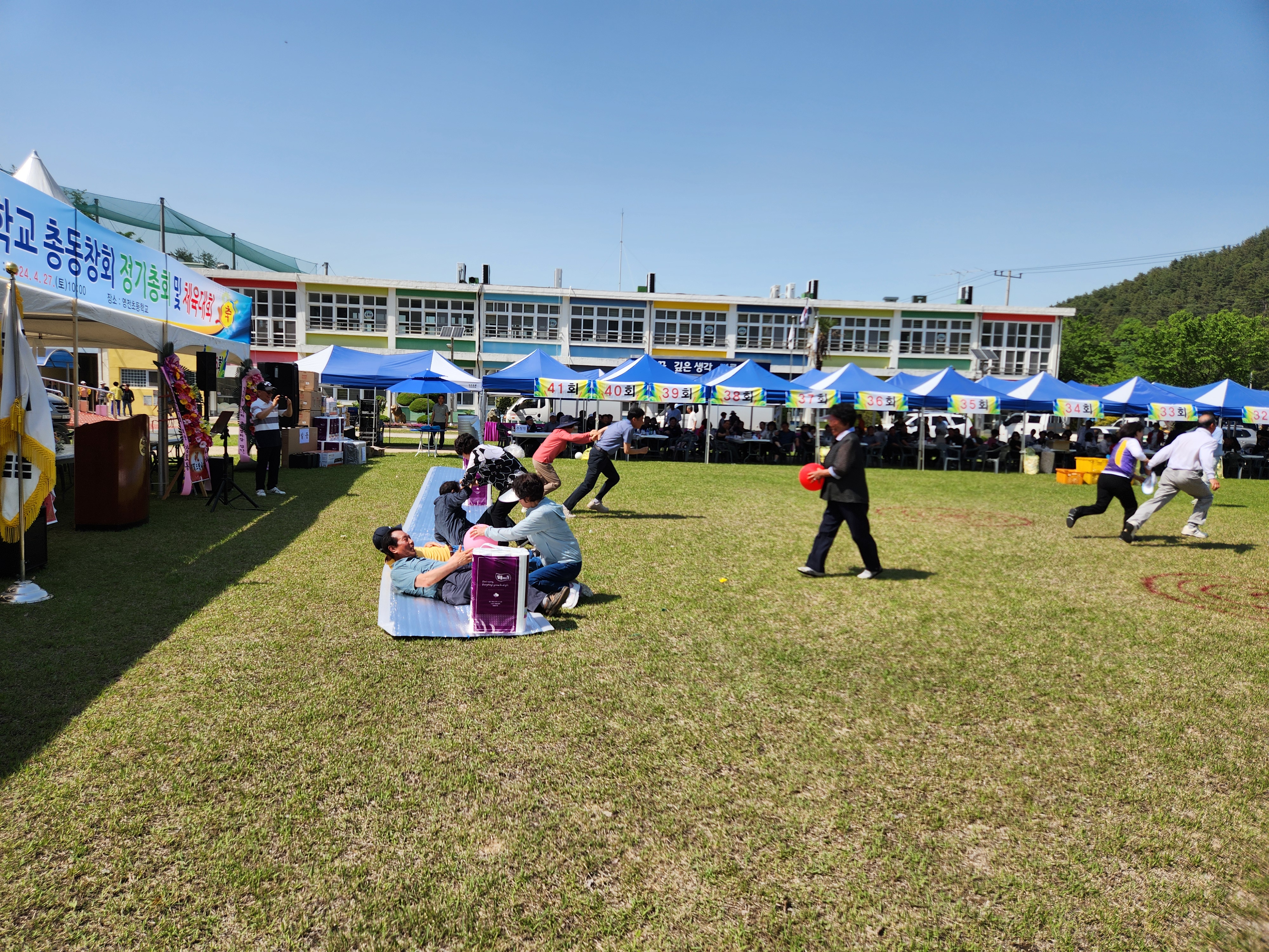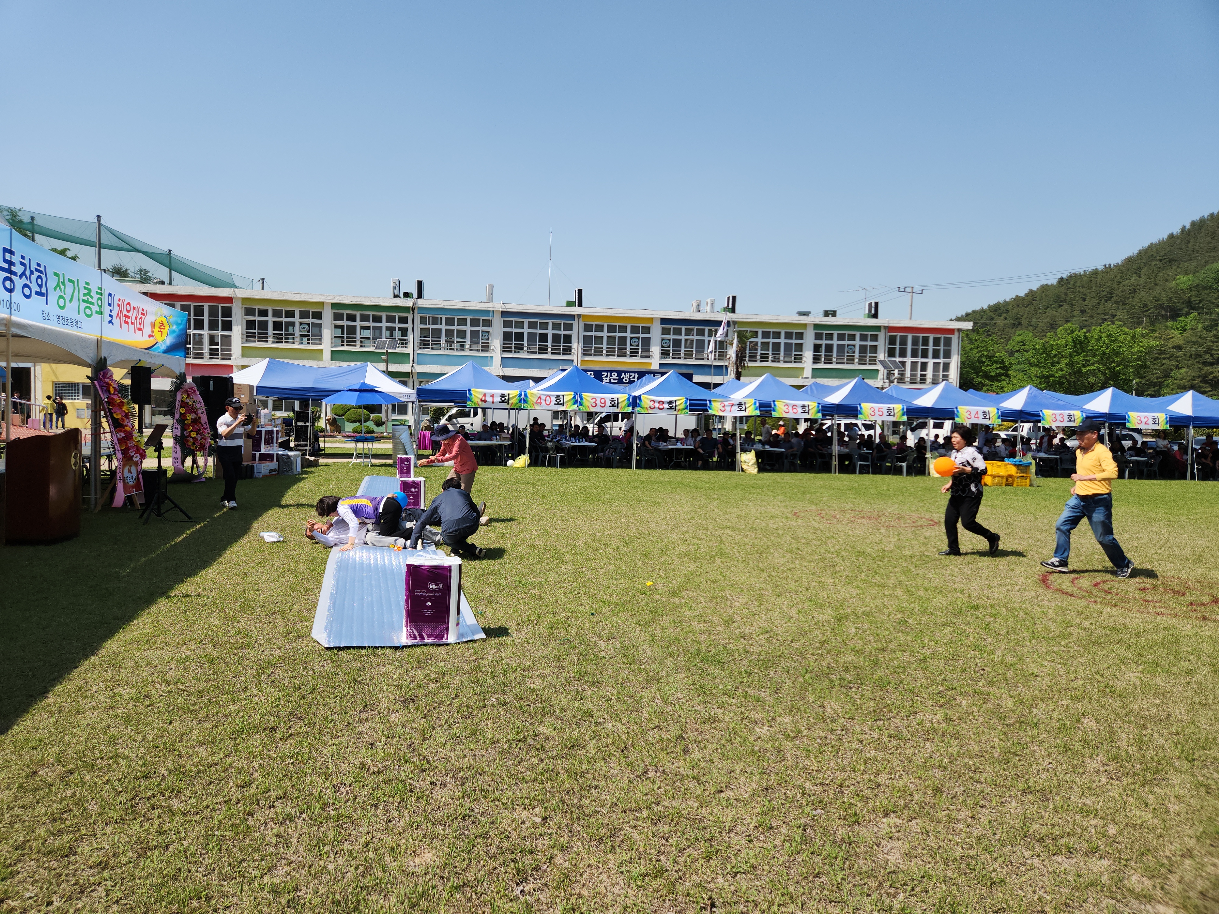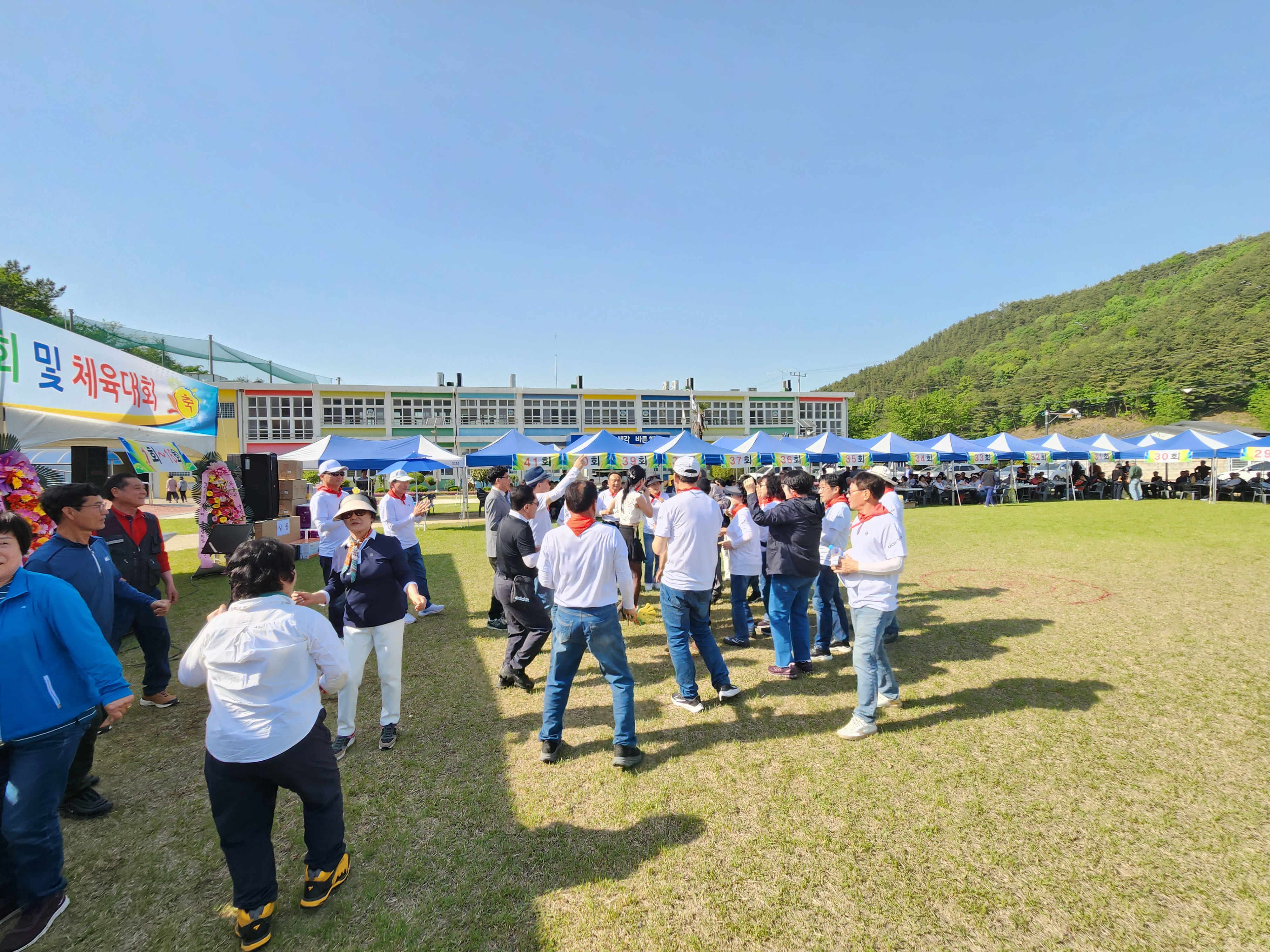 화창한 봄날씨에 운동장 둘레에 천막을 설치하여 그 중앙 공간에서 체육대회가 진행되었다.