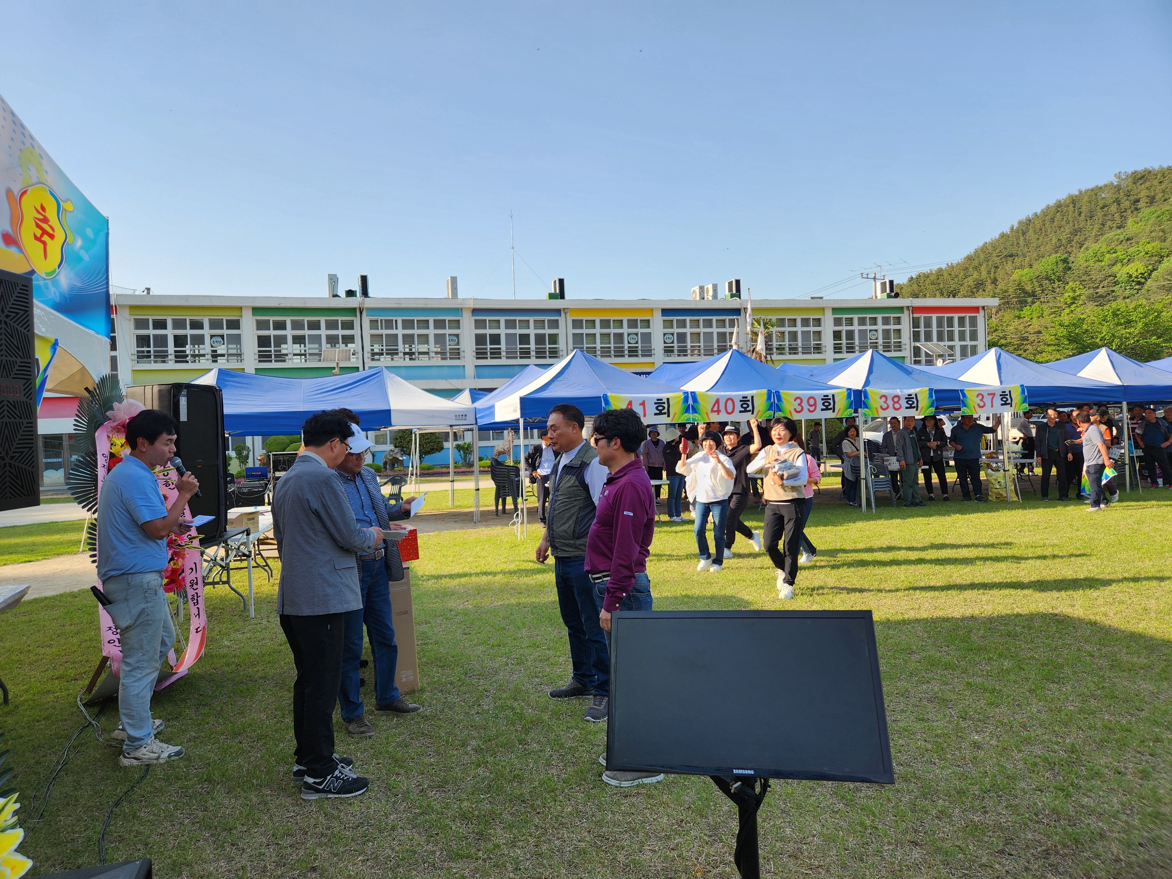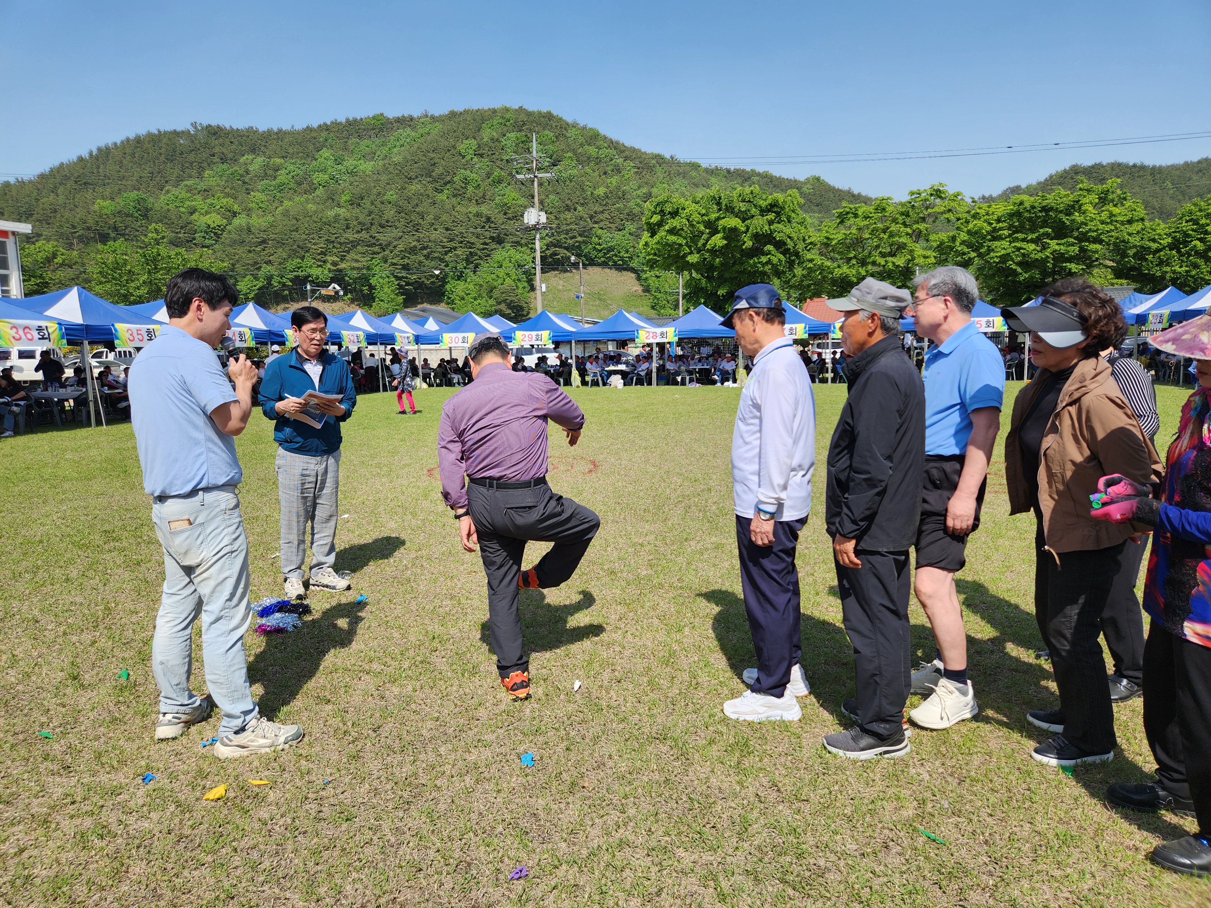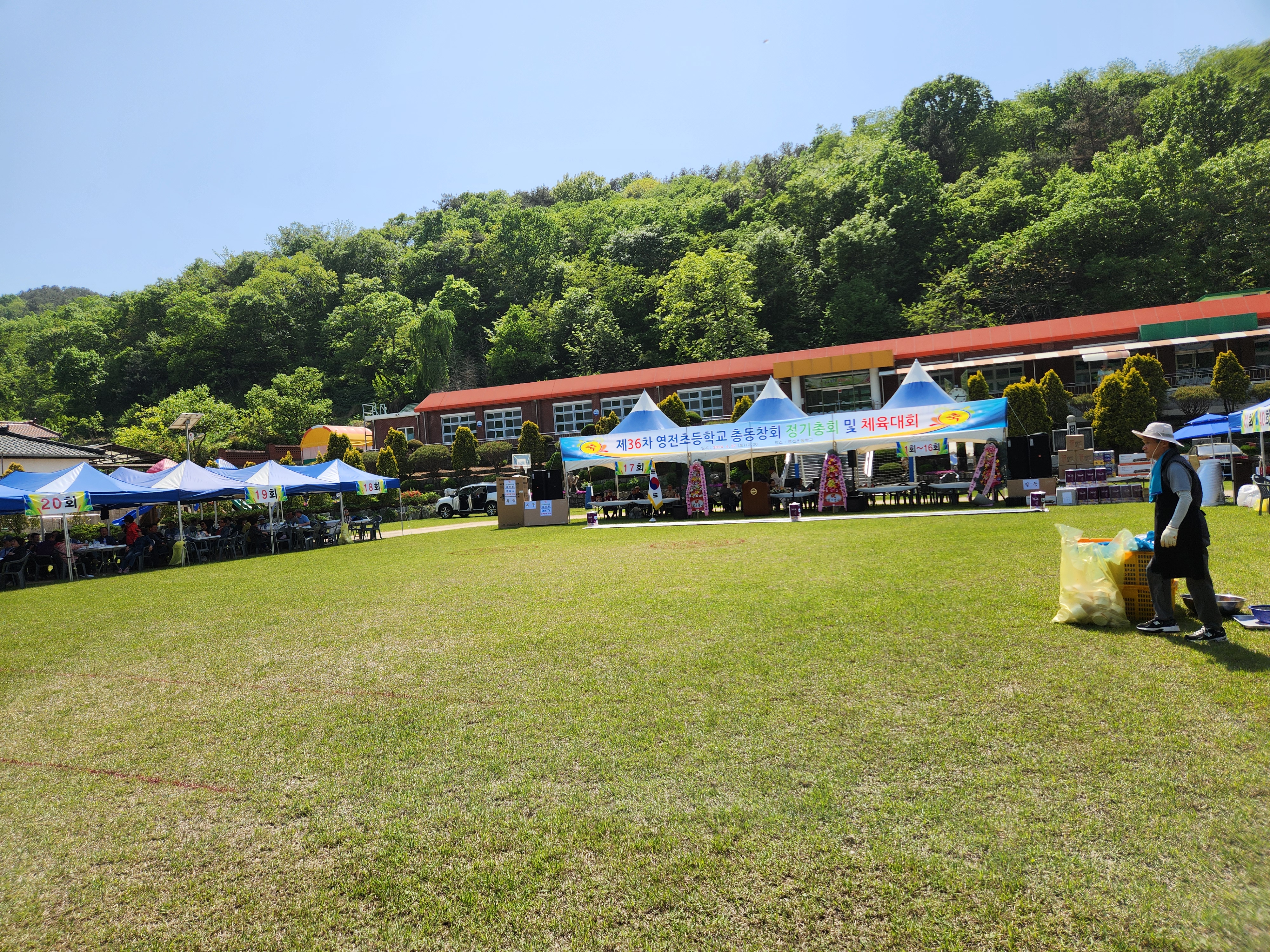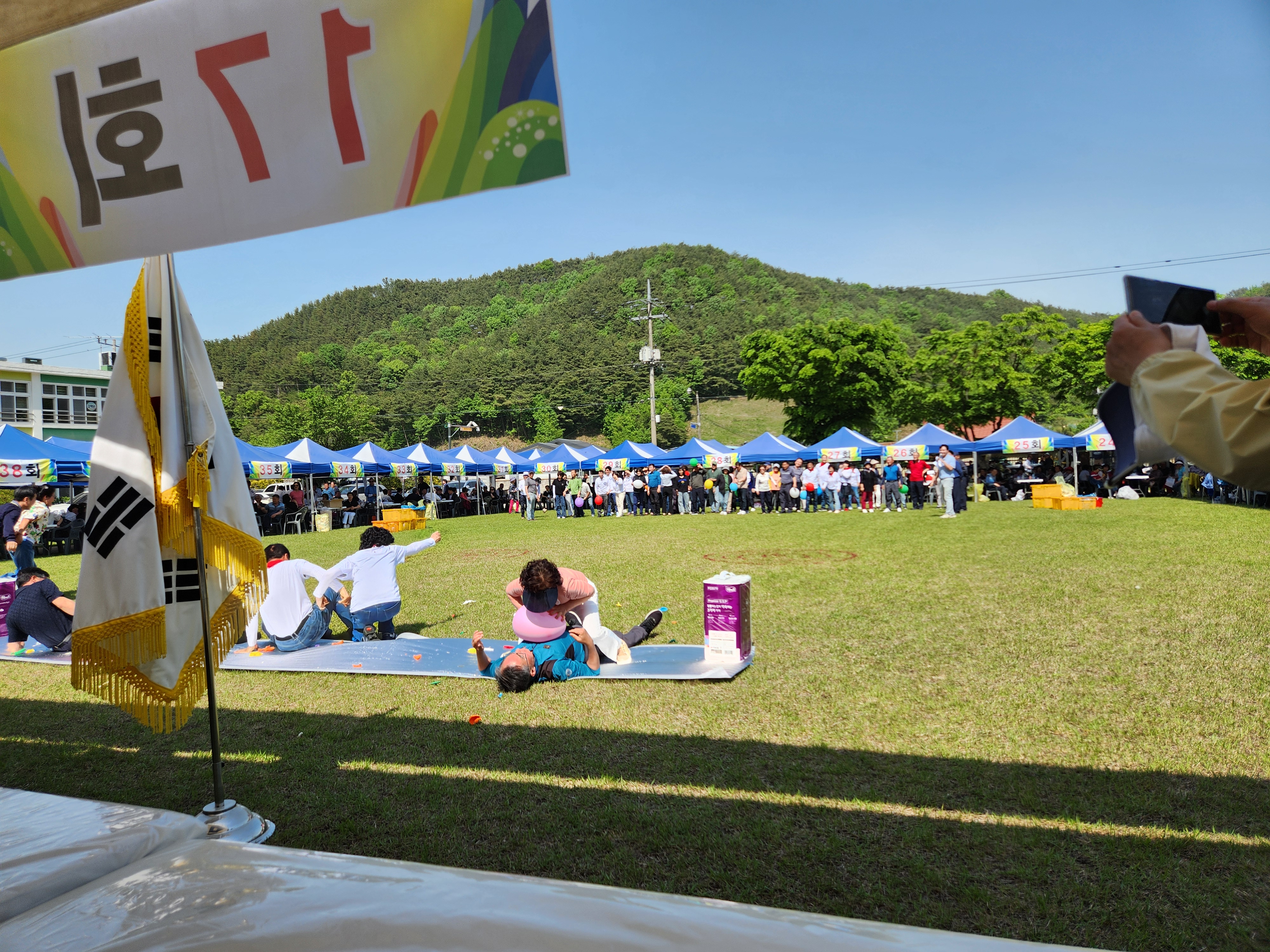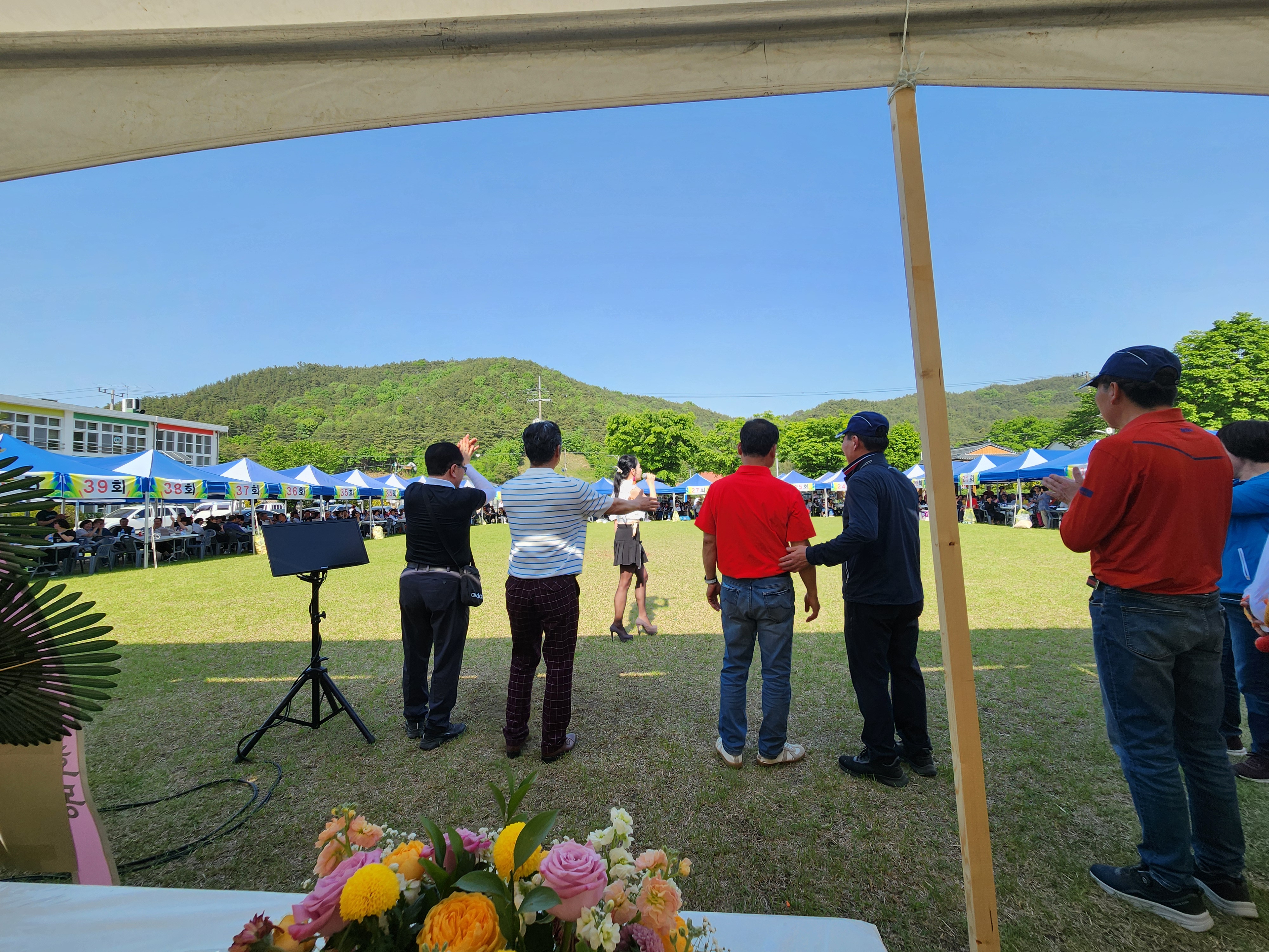 화창한 봄날씨에 운동장 둘레에 천막을 설치하여 그 중앙 공간에서 체육대회가 진행되었다.