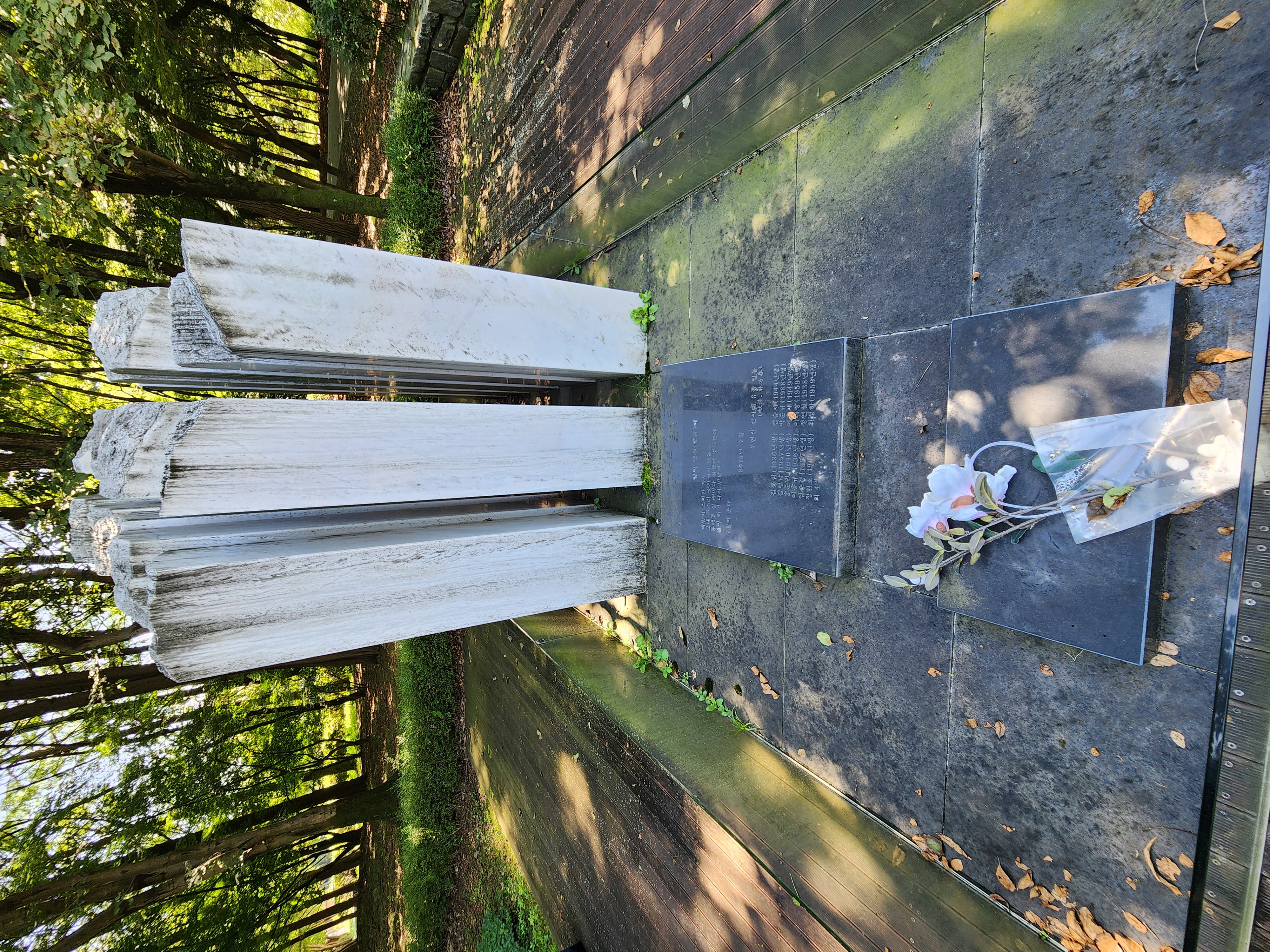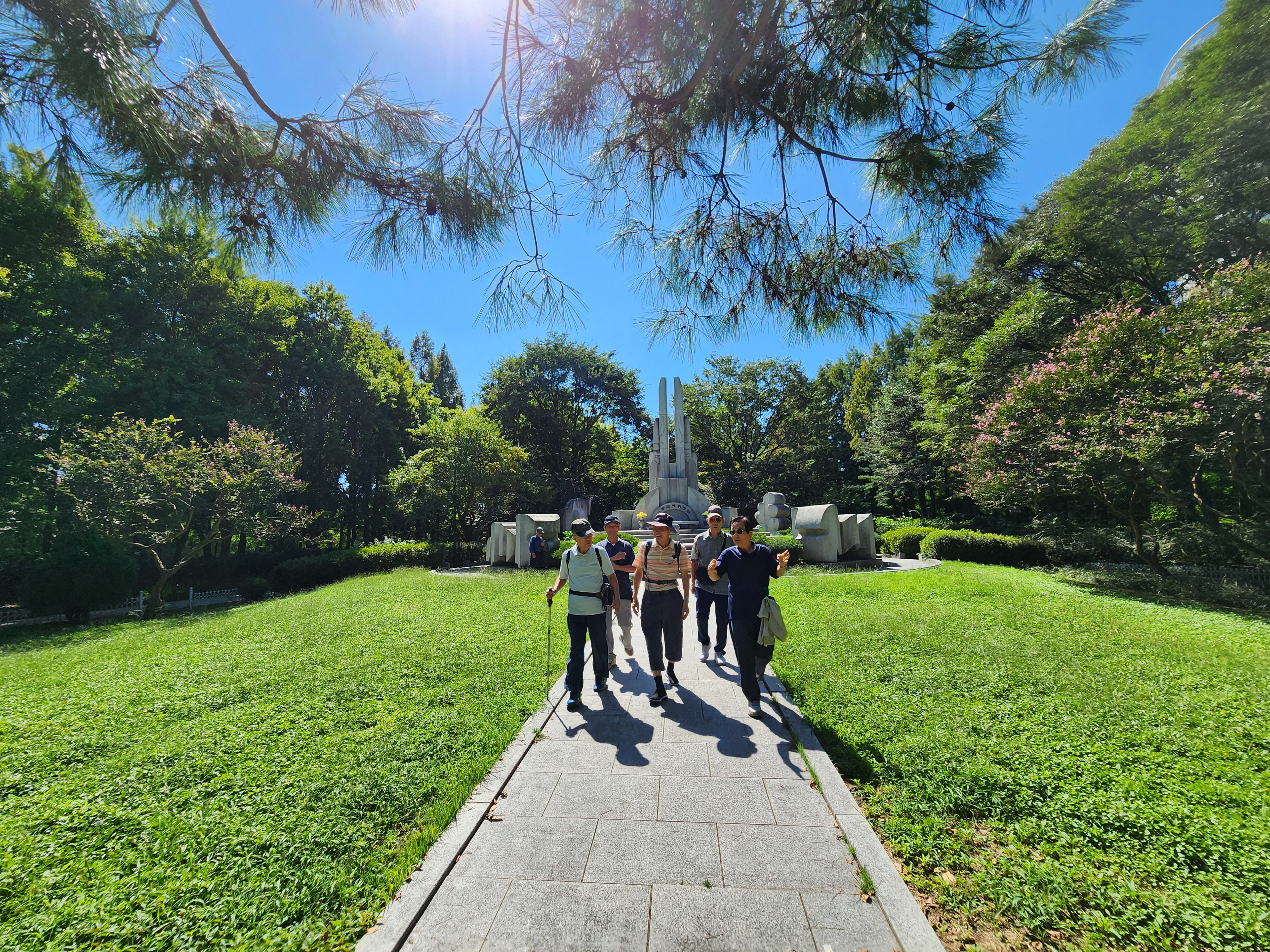 화창한 초가을 아침에 9명이 모였다. 여의천 남쪽 멀리 태극기가 펄럭인다. 그늘이 있는 여의천 서쪽 제방길에는 벚꽃나무가 하늘높이 자라 있다. 한참 가다가 공원으로 들어서면 바로 앞에 KAL858희생자 조형물이 있다. 86아시안게임, 88올림픽 참가가 위험하다는 경고를 보내려고 북한 공작원이 폭파한 것으로 드러났고 그 범인 김현희가 잡혀왔다. 참배를 하고 남쪽편에 세워진 삼풍백화점 사망자 추모비에도 참배했다. 우리 선배장군도 이름이 새겨져 있다. 옆의 정자 쉼터에 둘러앉아 커피한잔 나누면서 김명수동기의 詩 낭송회를 가졌다. 지난번 전시했던 시가 아니라 밤새 새로 썼다. 양재시민의숲에 있는 여러 추모비, 위의 두碑와 우면산사태 사망자, 6.25백마유격대 충혼탑 등을 다 아우르는 서사시를 낭송했다.(#아래에 첨부)