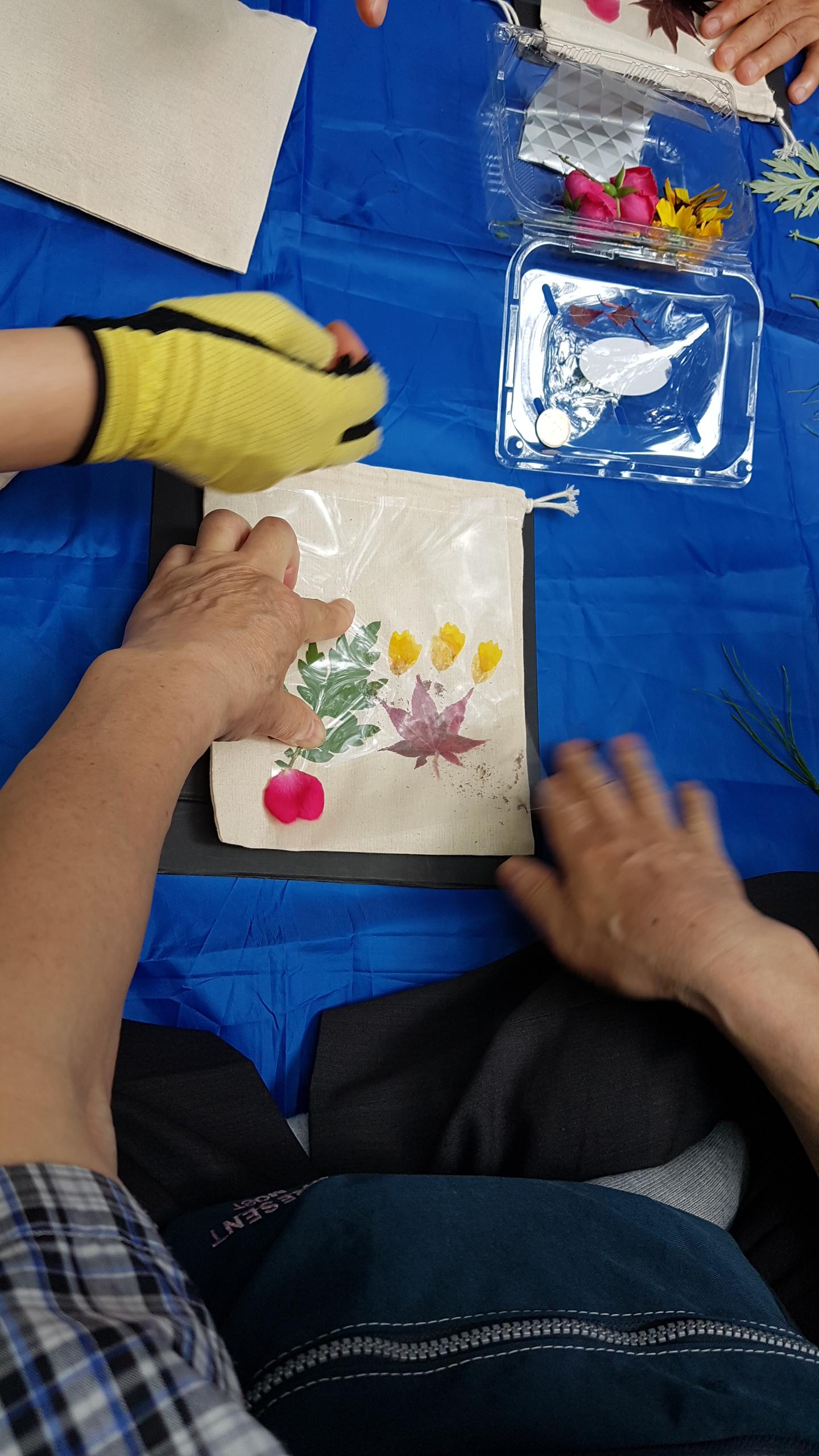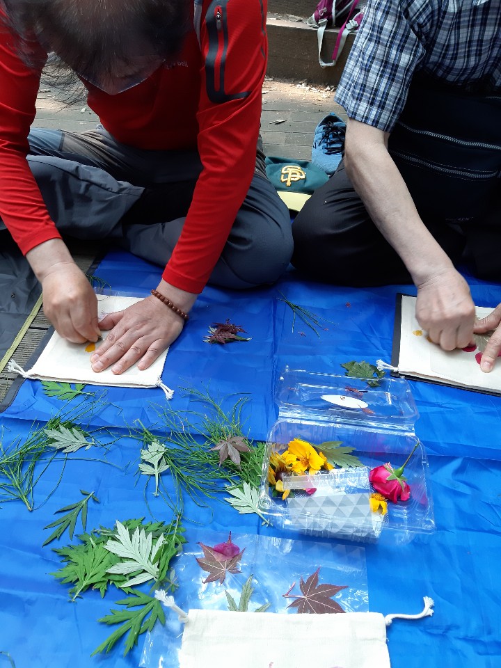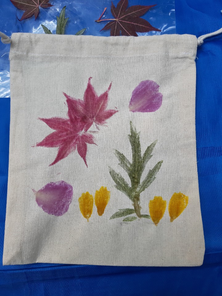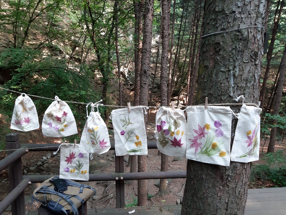 단풍잎 쑥 쇠뜨기풀 장미 금계국 등을 광목주머니에 동전으로 꾹꾹 눌러 물들이기