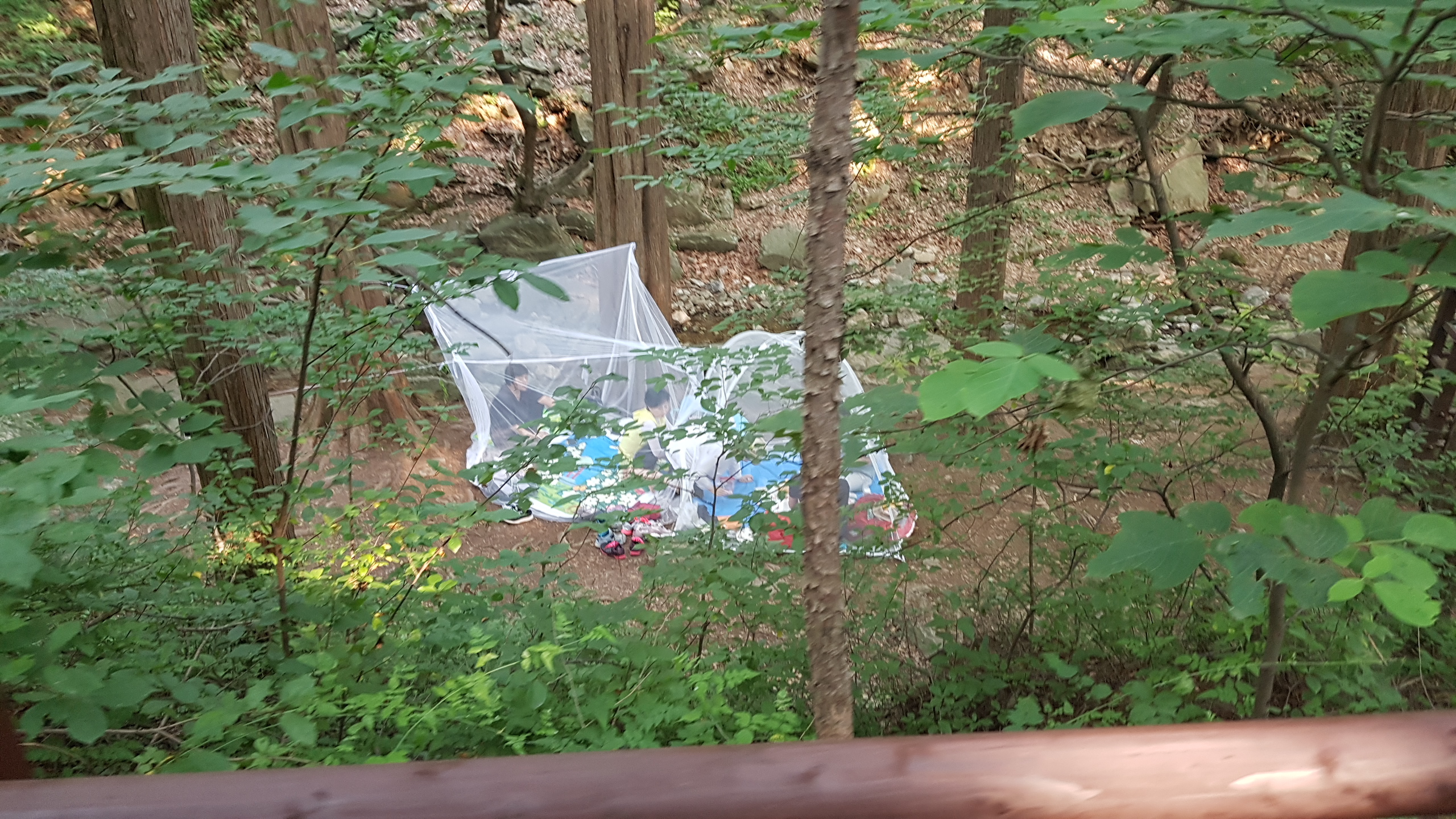 아주머니들이 모기장 쳐놓고 시원하게 놀고 있다.