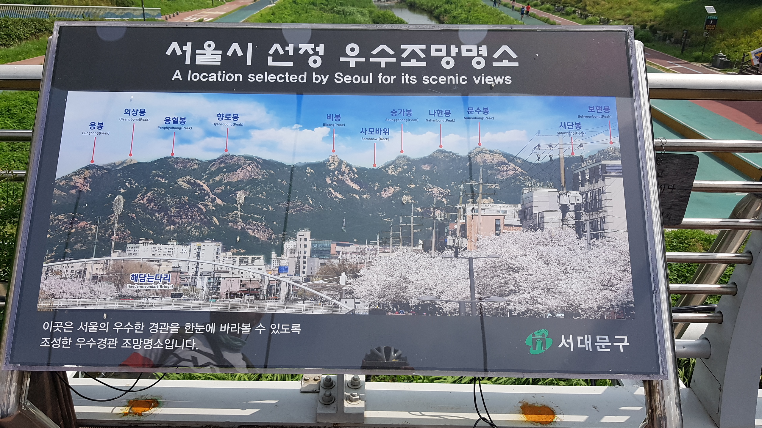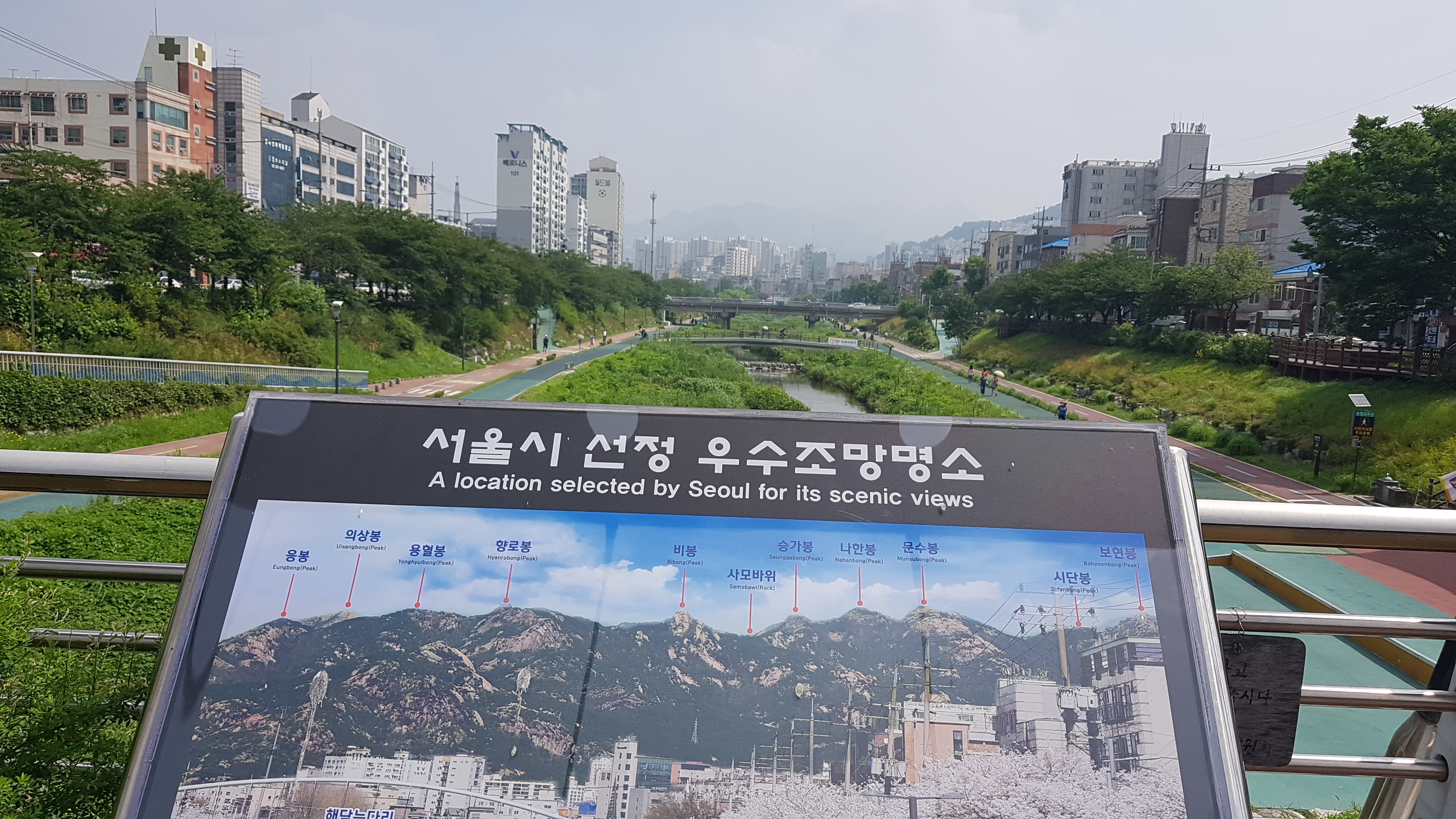 홍제천에 있는 우수조망 명소 다리 위에서 북쪽으로 보면 북한산 11개의 봉우리들이 잘 보인다.