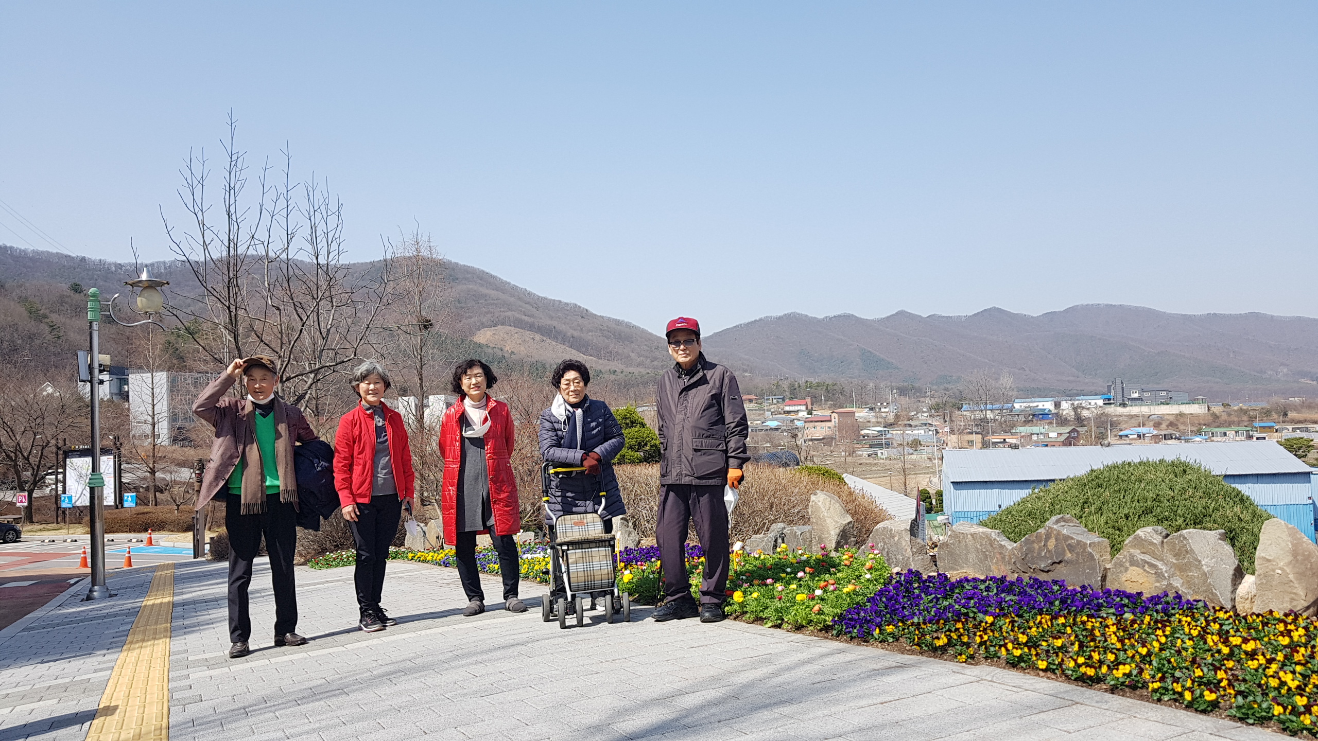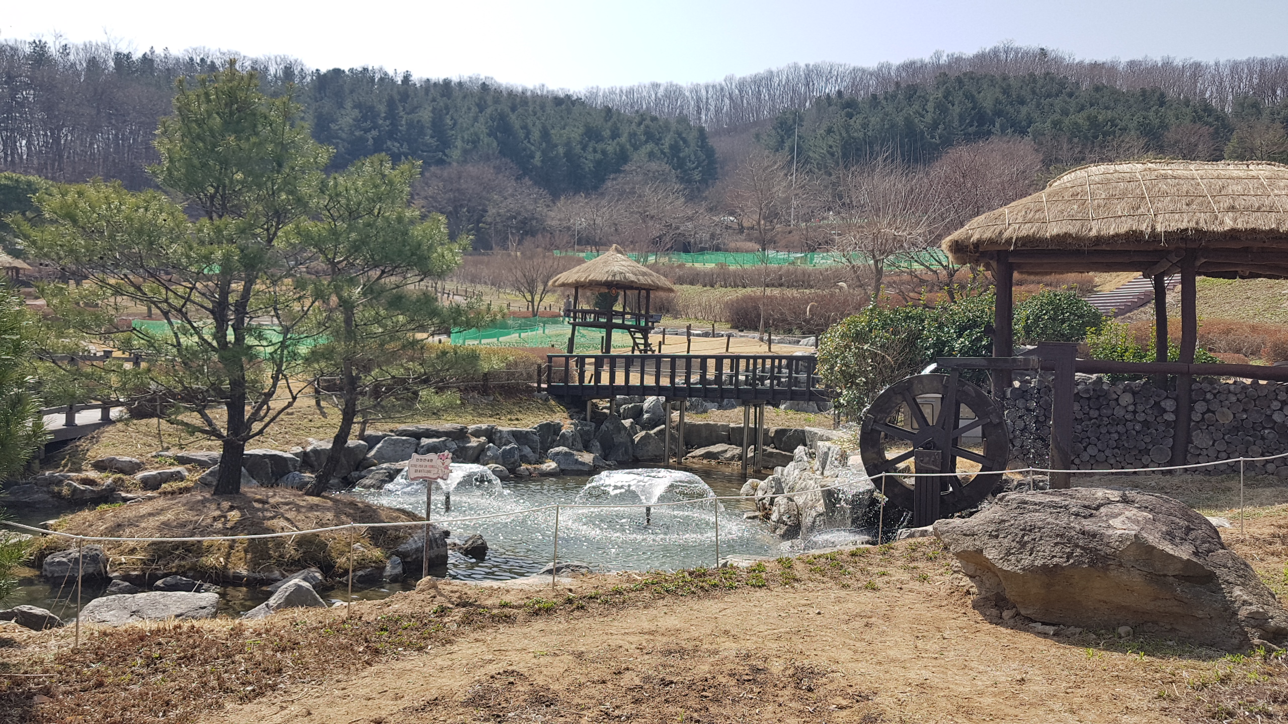 첫날 11시반 경에 '용인 농촌테마파크'에서 만나자고 하여 서울에서, 수원에서 시간에 맞춰 도착했다. 수년 전에 예쁜 꽃들이 많이 핀 시기에 단체로 방문한 적이 있었는데 지금은 화단에 옮겨심은 꽃과 이제 피기 시작하는 노오란 산수유정도만 꽃으로 보인다. 그래도 푸근한 날씨에 분수가 솟고 물레방아가 돌아가니 봄풍경이 살아난다. 여러군데 원두막들과 쉴 수 있는 공간들이 많아 봄가을에 오면 놀고 가기 딱 좋을 듯싶다.